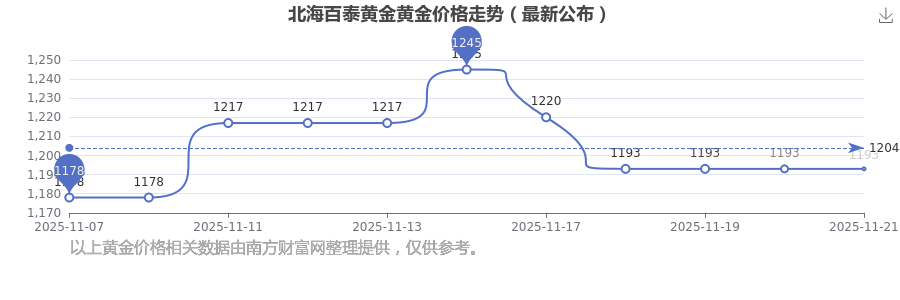 北海百泰黄金黄金价格在 2025年11月22日,其市场价格为 1193.0元/克。