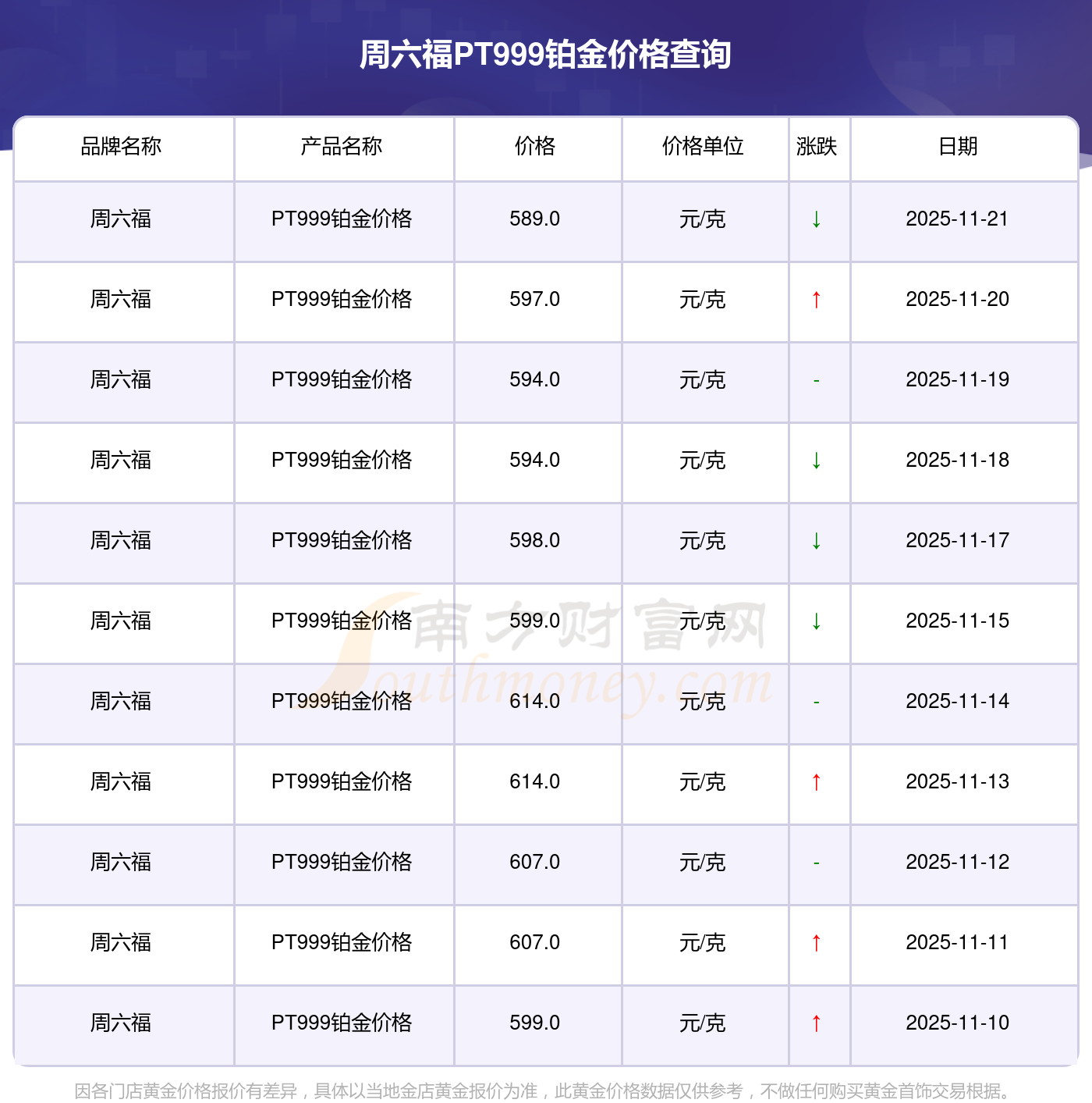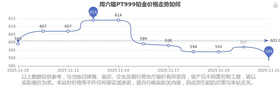 今日(2025年11月22日)周六福PT999铂金价格:589.0元/克。
