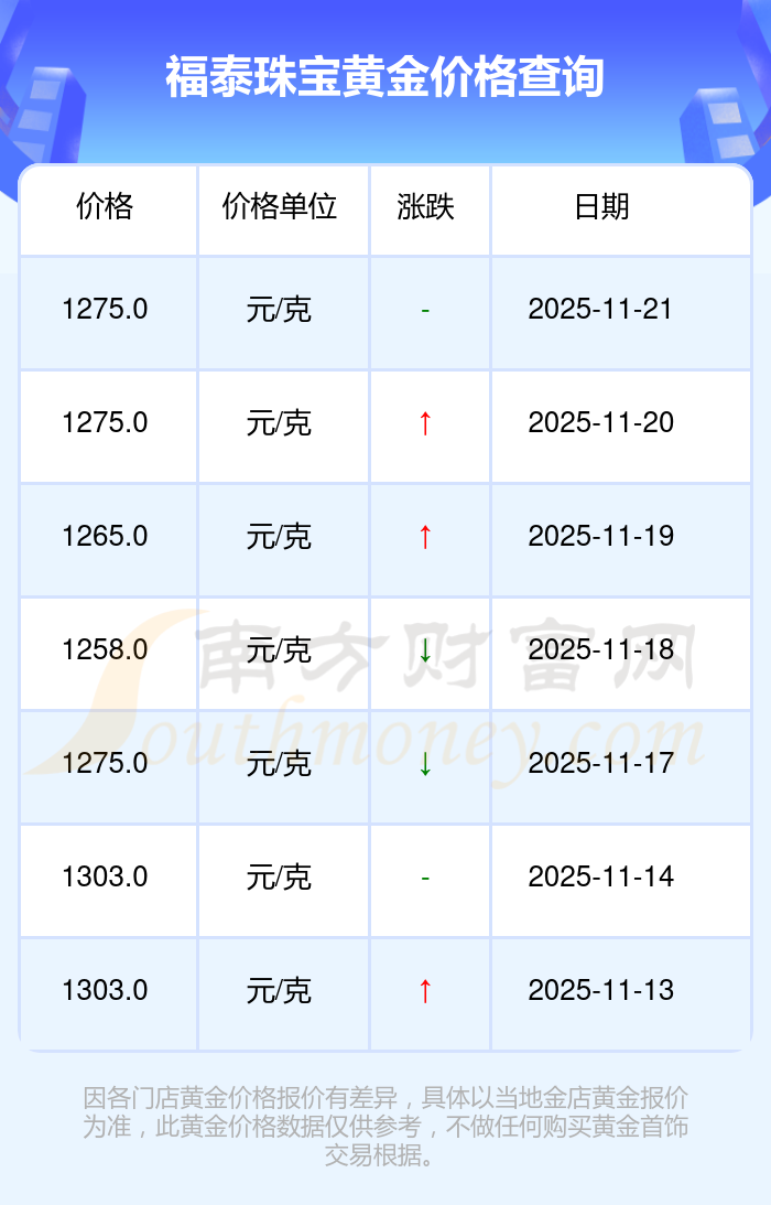 今日黄金价格查询_现在金价黄金一克多少钱,黄金价格是多少钱一克?黄金是一种优良的导电导热材料,具有良好的导热特性。黄金常用于电子工业中的特殊电路设计,因其化学稳定性高、抗氧化性强,可制作高精度电子元件。今日(2025年11月22日),福泰珠宝黄金价格最新价格是1275.0元/克。