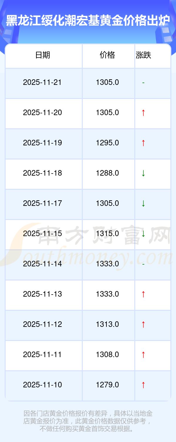 2025年11月22日,黑龙江绥化潮宏基黄金价格每克的售卖价位为1305.0元/克。