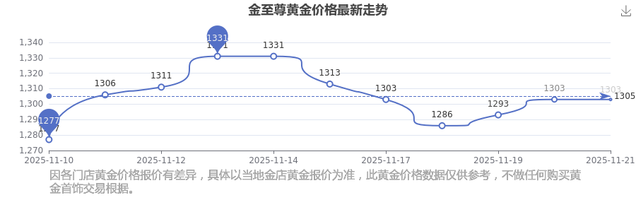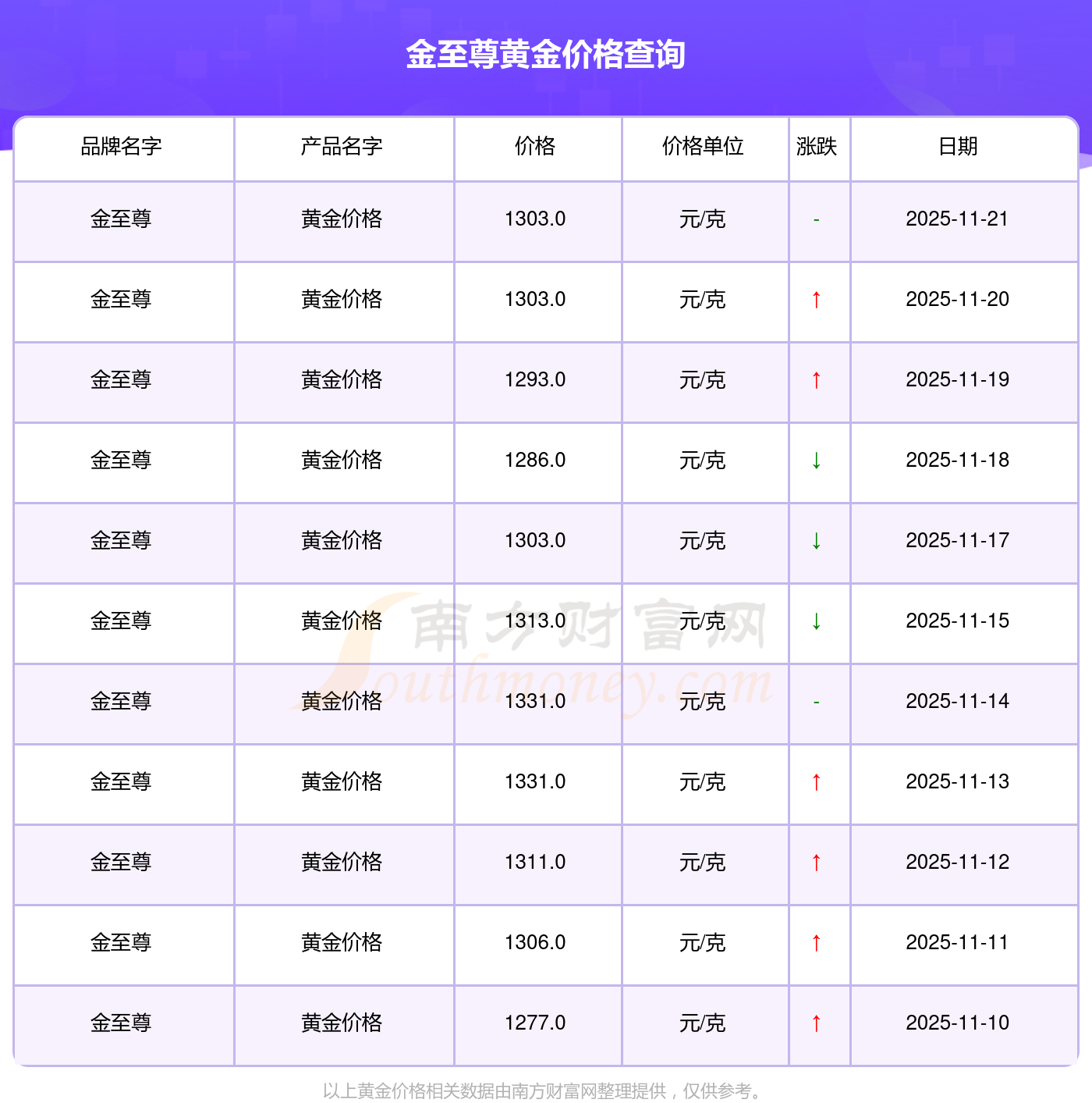 今日金至尊所公布的 黄金价格最新价格为1303.0元/克。