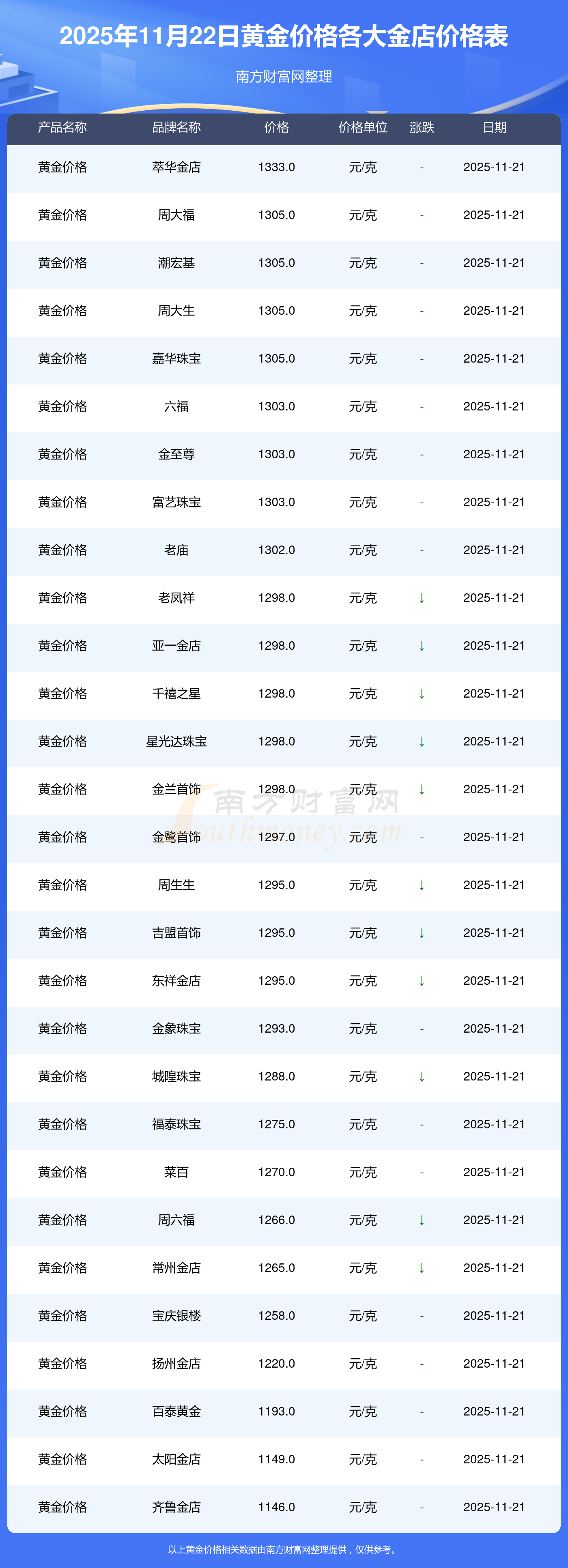 2025年11月22日,周大福、周大福、周大福、周大福、周大福、周大福、周大福、老凤祥、老凤祥、老凤祥、周六福等各大金店品牌黄金价格今日价格如下:周大福1305.0元/克、周大福616.0元/克、周大福1305.0元/克、周大福45110.0、周大福17570.0、周大福40690.0、周大福1143.0元/克、老凤祥1298.0元/克、老凤祥600.0元/克、老凤祥1298.0元/克、周六福1266.0元/克。