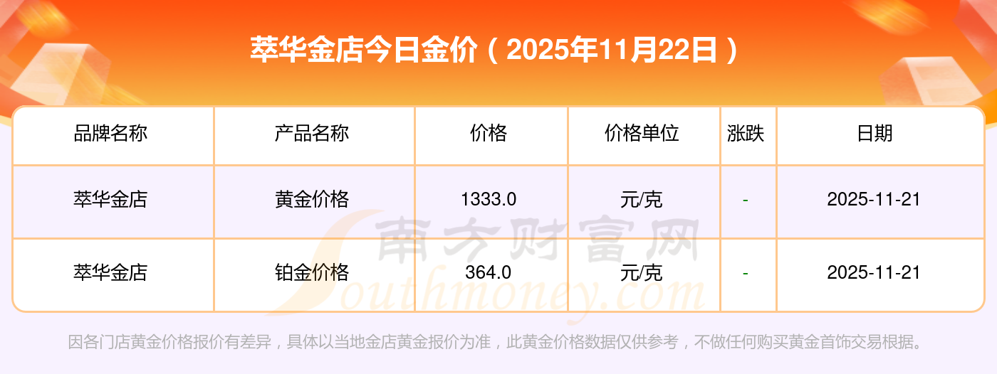 萃华金店现在金价多少钱一克?萃华金店今天黄金价格多少一克?最新萃华金店查询,2025年11月22日萃华金店黄金价格现在每克多少钱?最新萃华金店黄金价格报价公布,一起来看看吧!