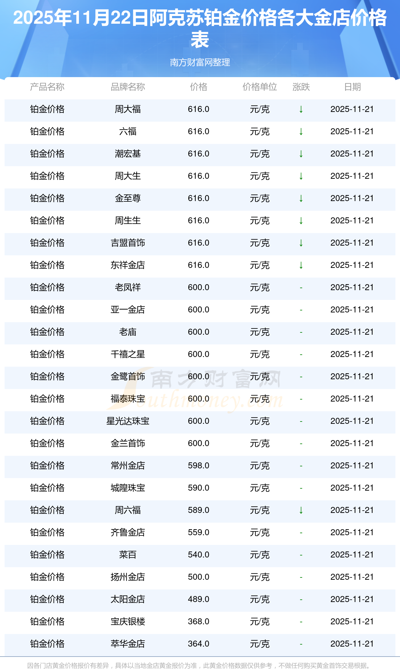 2025年11月22日阿克苏各大金店铂金价格最新价格:周大福1305.0元/克,周大福616.0元/克,周大福1305.0元/克,周大福45110.0,周大福17570.0,周大福40690.0,周大福1143.0元/克,老凤祥1298.0元/克,老凤祥600.0元/克,老凤祥1298.0元/克,周六福1266.0元/克。