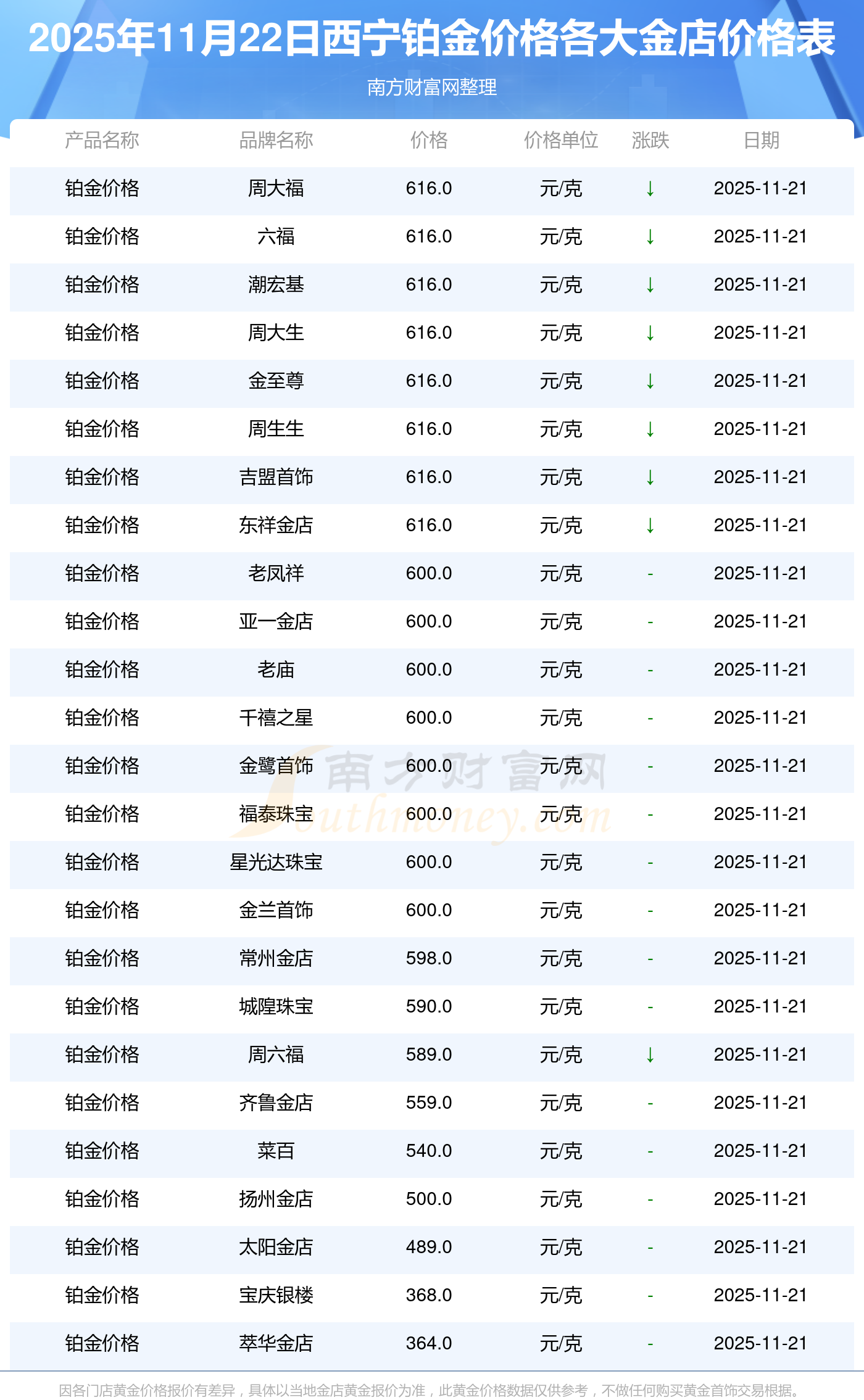 今日西宁铂金价格最低的金店是萃华金店,报价364.0元/克,最高的是周大福,报价616.0元/克。今日铂金价格高低差为252元/克。