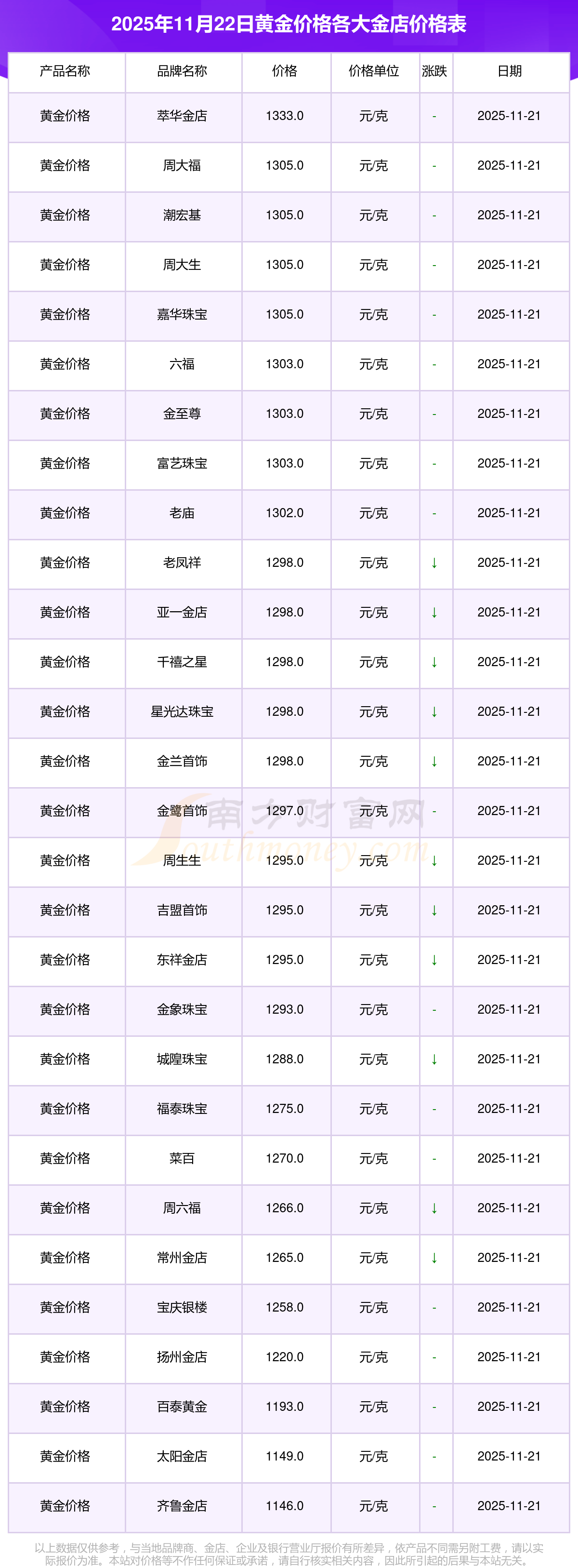 2025年11月22日周大福、周大福、周大福、周大福、周大福、周大福、周大福、老凤祥、老凤祥、老凤祥、周六福等各大金店品牌黄金价格最新价格如下:周大福黄金价格1305.0元/克,周大福铂金价格616.0元/克,周大福饰品金价(内地)1305.0元/克,周大福黄金饰品(香港)45110.0,周大福铂金价格(香港)17570.0,周大福金条价格(香港)40690.0,周大福金条金价(内地)1143.0元/克,老凤祥黄金价格1298.0元/克,老凤祥铂金价格600.0元/克,老凤祥足金价格1298.0元/克,周六福黄金价格1266.0元/克。