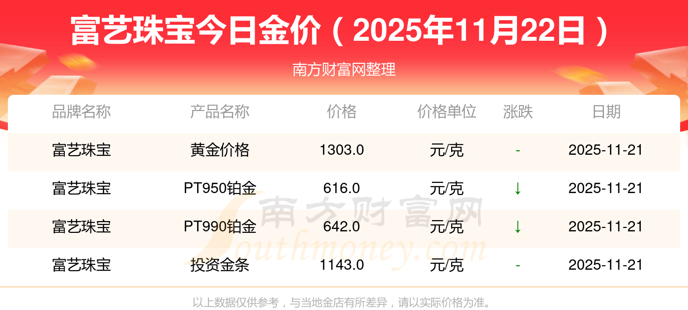 2025年11月22日富艺珠宝最新价格:黄金价格1305.0元/克,铂金价格616.0元/克,饰品金价(内地)1305.0元/克,黄金饰品(香港)45110.0,铂金价格(香港)17570.0,金条价格(香港)40690.0,金条金价(内地)1143.0元/克,黄金价格1298.0元/克,铂金价格600.0元/克,足金价格1298.0元/克,黄金价格1266.0元/克。