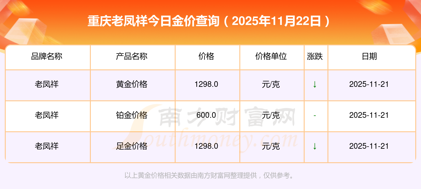 今天黄金价格行情如何?现在一克黄金的售价是多少?重庆老凤祥,现在一克黄金定价多少?黄金价格1305.0元/克,铂金价格616.0元/克,饰品金价(内地)1305.0元/克,黄金饰品(香港)45110.0,铂金价格(香港)17570.0,金条价格(香港)40690.0,金条金价(内地)1143.0元/克,黄金价格1298.0元/克,铂金价格600.0元/克,足金价格1298.0元/克,黄金价格1266.0元/克。