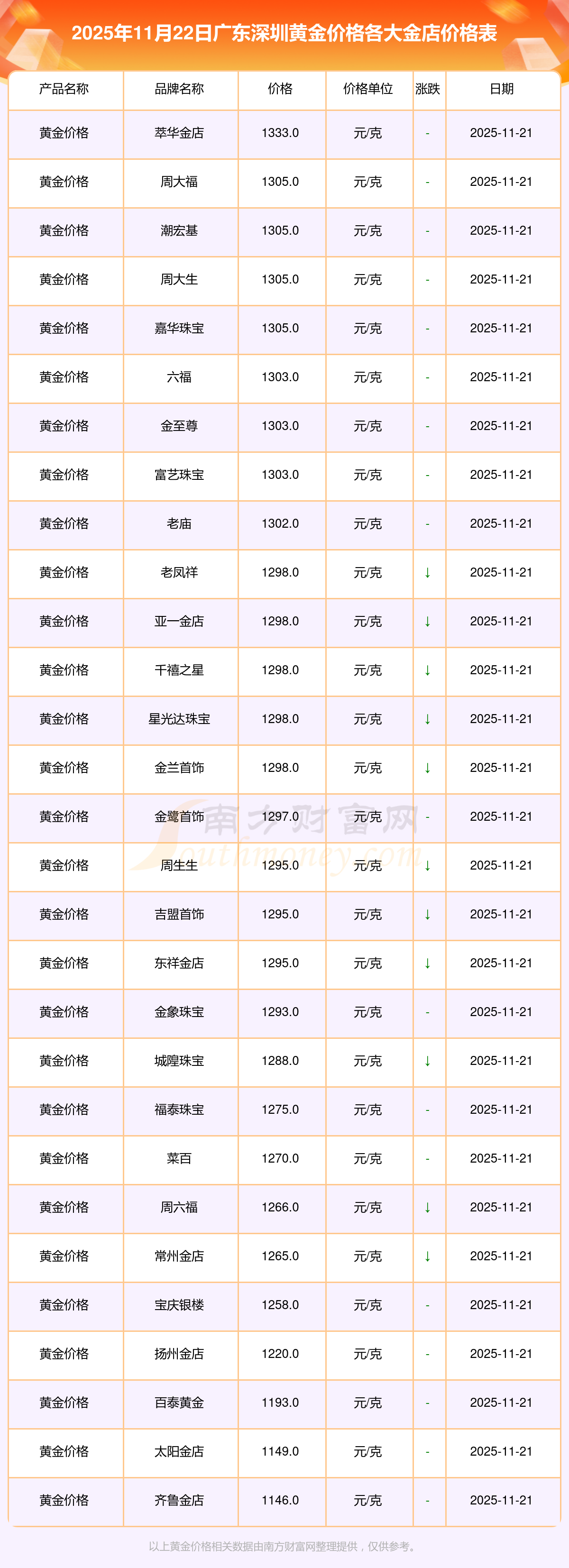 2025年11月22日广东深圳各大金店黄金价格最新价格:周大福1305.0元/克,周大福616.0元/克,周大福1305.0元/克,周大福45110.0,周大福17570.0,周大福40690.0,周大福1143.0元/克,老凤祥1298.0元/克,老凤祥600.0元/克,老凤祥1298.0元/克,周六福1266.0元/克。