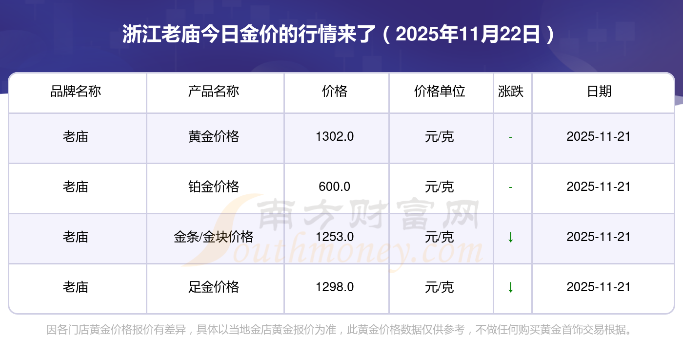 2025年11月22日浙江老庙最新价格:黄金价格1305.0元/克,铂金价格616.0元/克,饰品金价(内地)1305.0元/克,黄金饰品(香港)45110.0,铂金价格(香港)17570.0,金条价格(香港)40690.0,金条金价(内地)1143.0元/克,黄金价格1298.0元/克,铂金价格600.0元/克,足金价格1298.0元/克,黄金价格1266.0元/克。