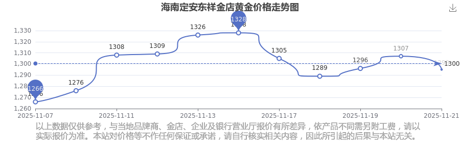 于 2025年11月22日,海南定安东祥金店黄金价格的克价为1295.0元/克。