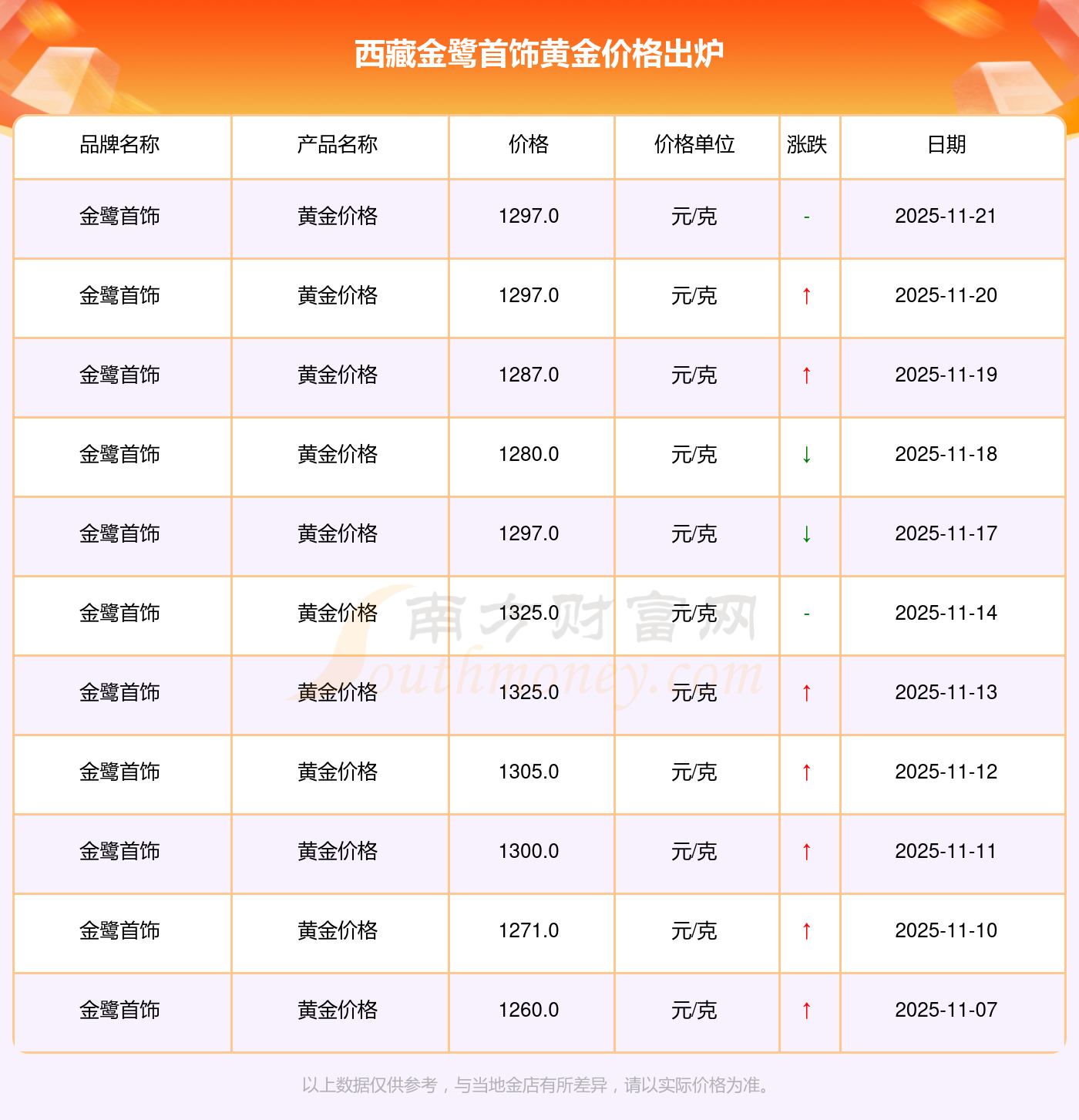 (2025年11月22日)今日西藏金鹭首饰黄金价格是1297.0元/克。