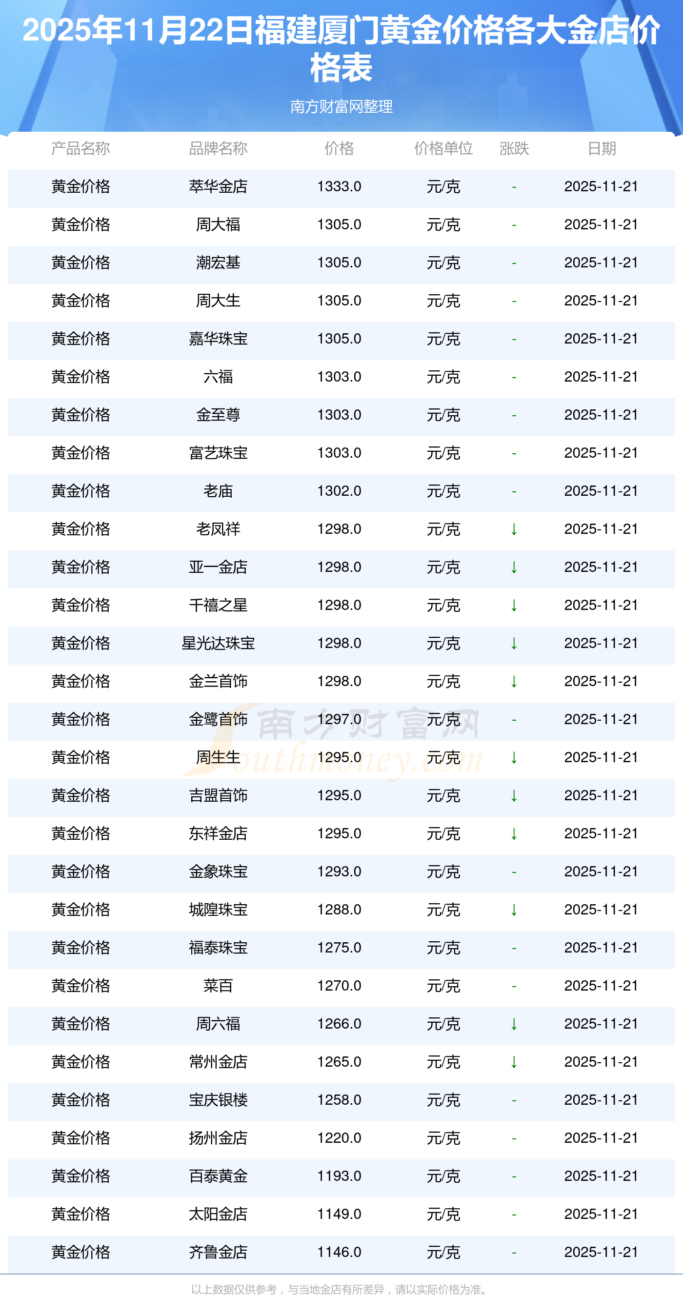 以上数据仅供参考,与当地金店有所差异,请以实际价格为准。