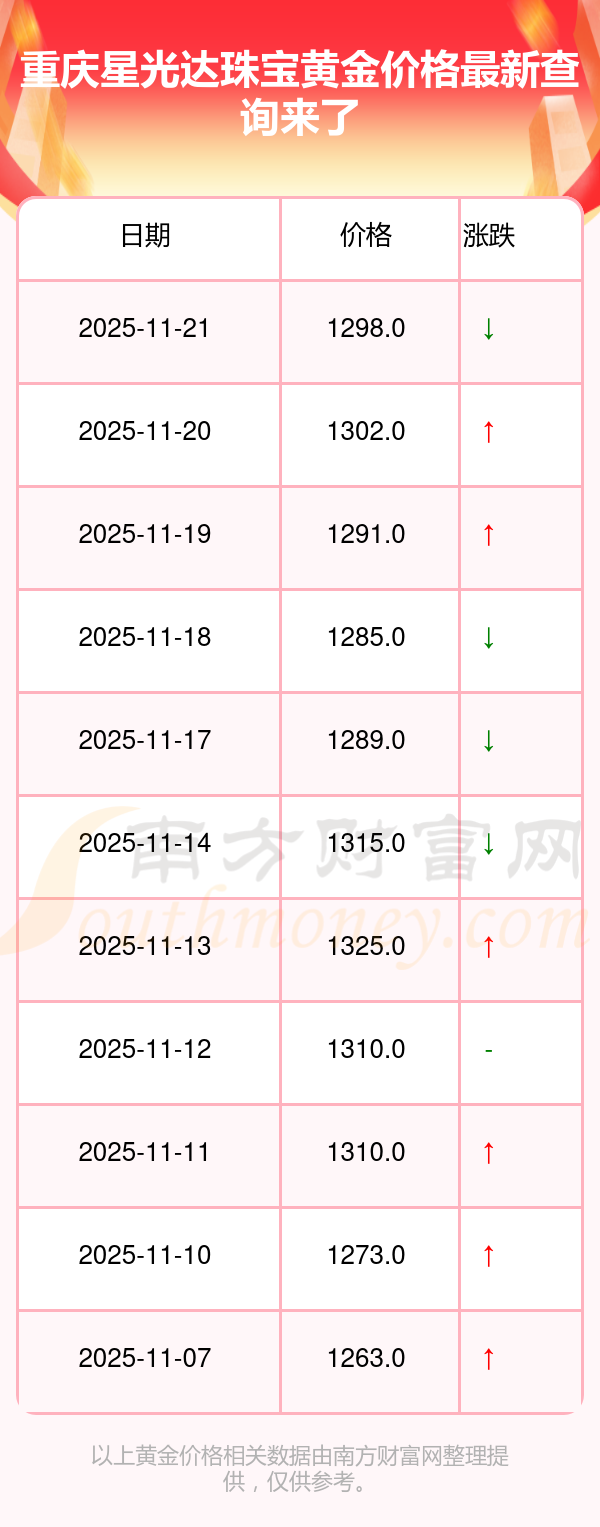 重庆星光达珠宝黄金价格在 2025年11月22日,其市场价格为 1298.0元/克。