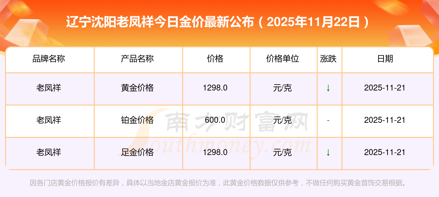 2025年11月22日辽宁沈阳老凤祥金价查询:黄金价格1305.0元/克,铂金价格616.0元/克,饰品金价(内地)1305.0元/克,黄金饰品(香港)45110.0,铂金价格(香港)17570.0,金条价格(香港)40690.0,金条金价(内地)1143.0元/克,黄金价格1298.0元/克,铂金价格600.0元/克,足金价格1298.0元/克,黄金价格1266.0元/克。