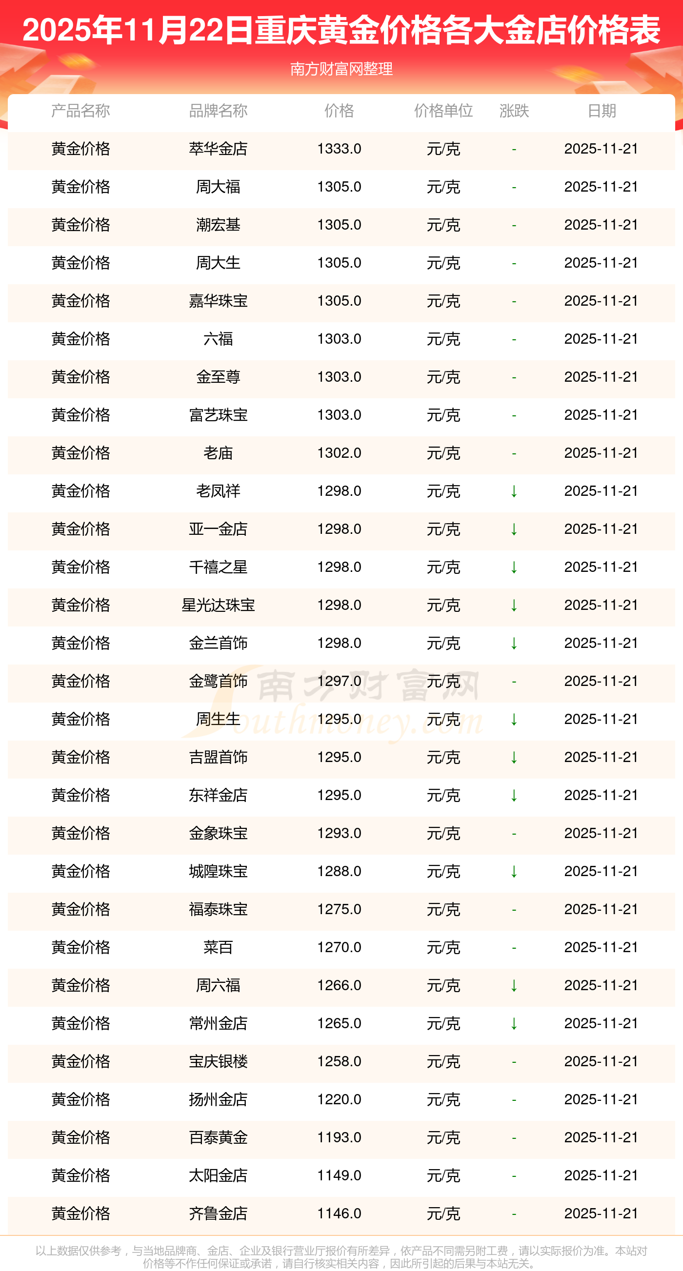 2025年11月22日重庆周大福、周大福、周大福、周大福、周大福、周大福、周大福、老凤祥、老凤祥、老凤祥、周六福等各大金店品牌黄金价格最新价格行情来了,如下:周大福黄金价格1305.0元/克,周大福铂金价格616.0元/克,周大福饰品金价(内地)1305.0元/克,周大福黄金饰品(香港)45110.0,周大福铂金价格(香港)17570.0,周大福金条价格(香港)40690.0,周大福金条金价(内地)1143.0元/克,老凤祥黄金价格1298.0元/克,老凤祥铂金价格600.0元/克,老凤祥足金价格1298.0元/克,周六福黄金价格1266.0元/克。