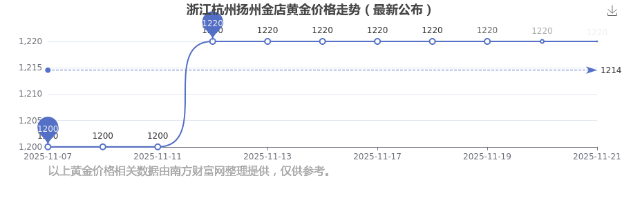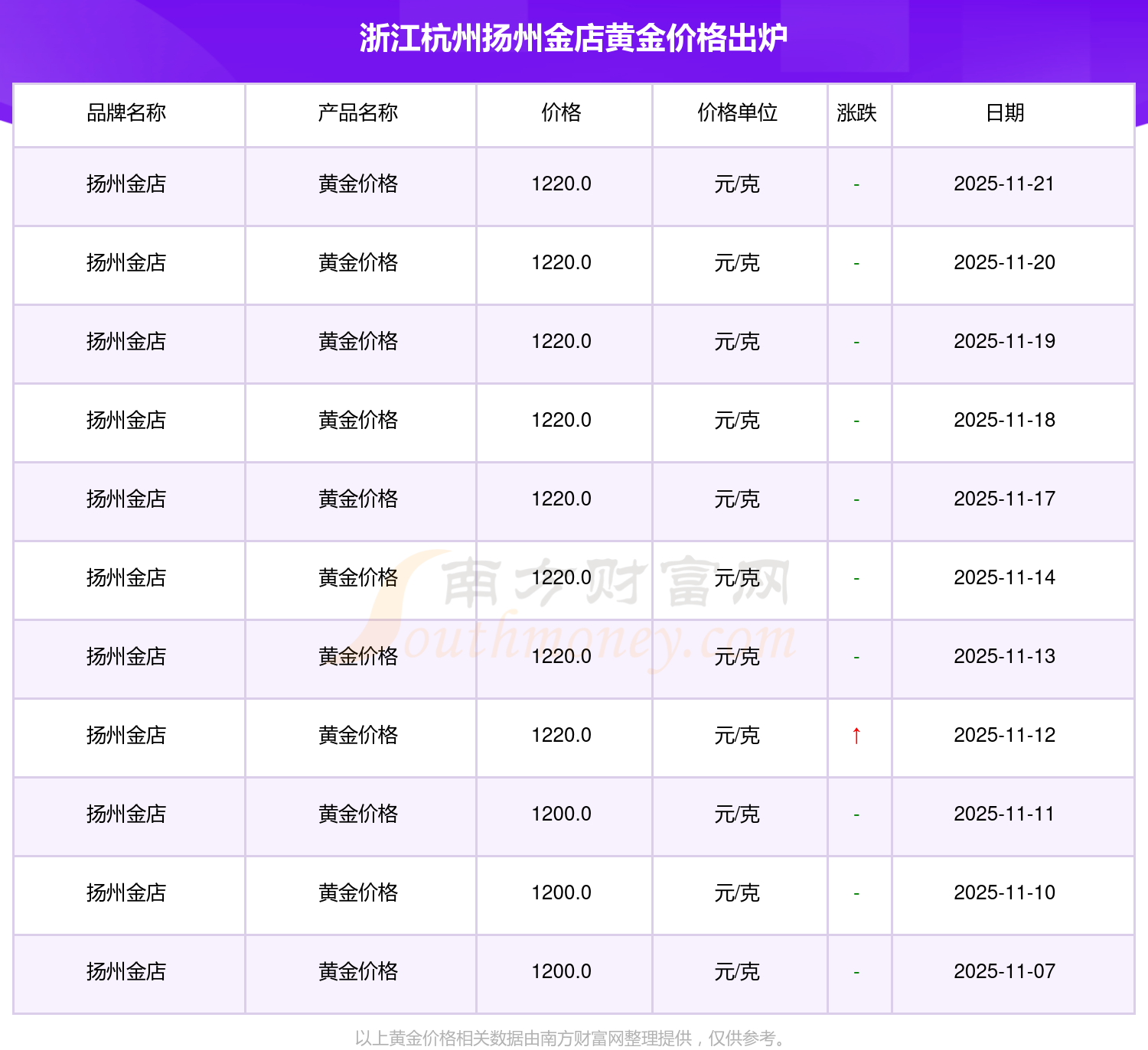 (2025年11月22日)浙江杭州扬州金店黄金价格现在为1220.0元/克。