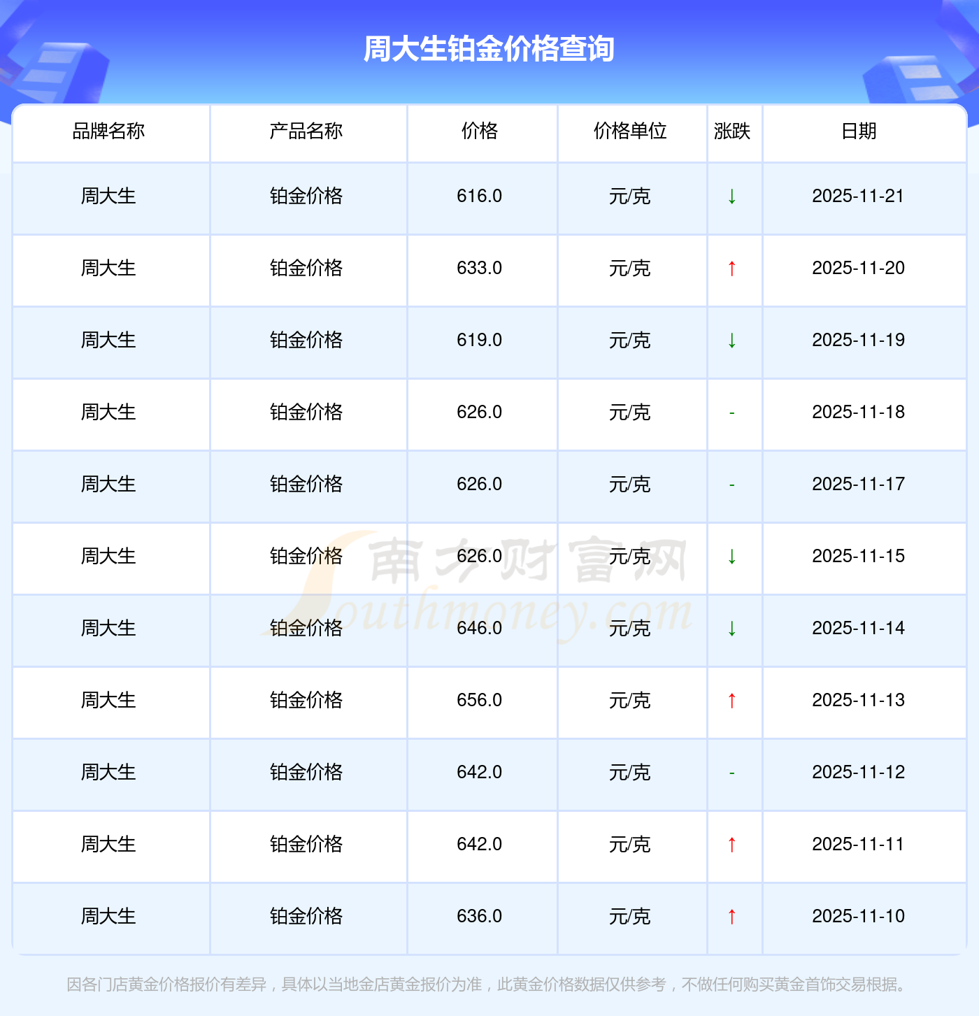 最新数据表明,周大生今日 铂金价格为616.0元/克。