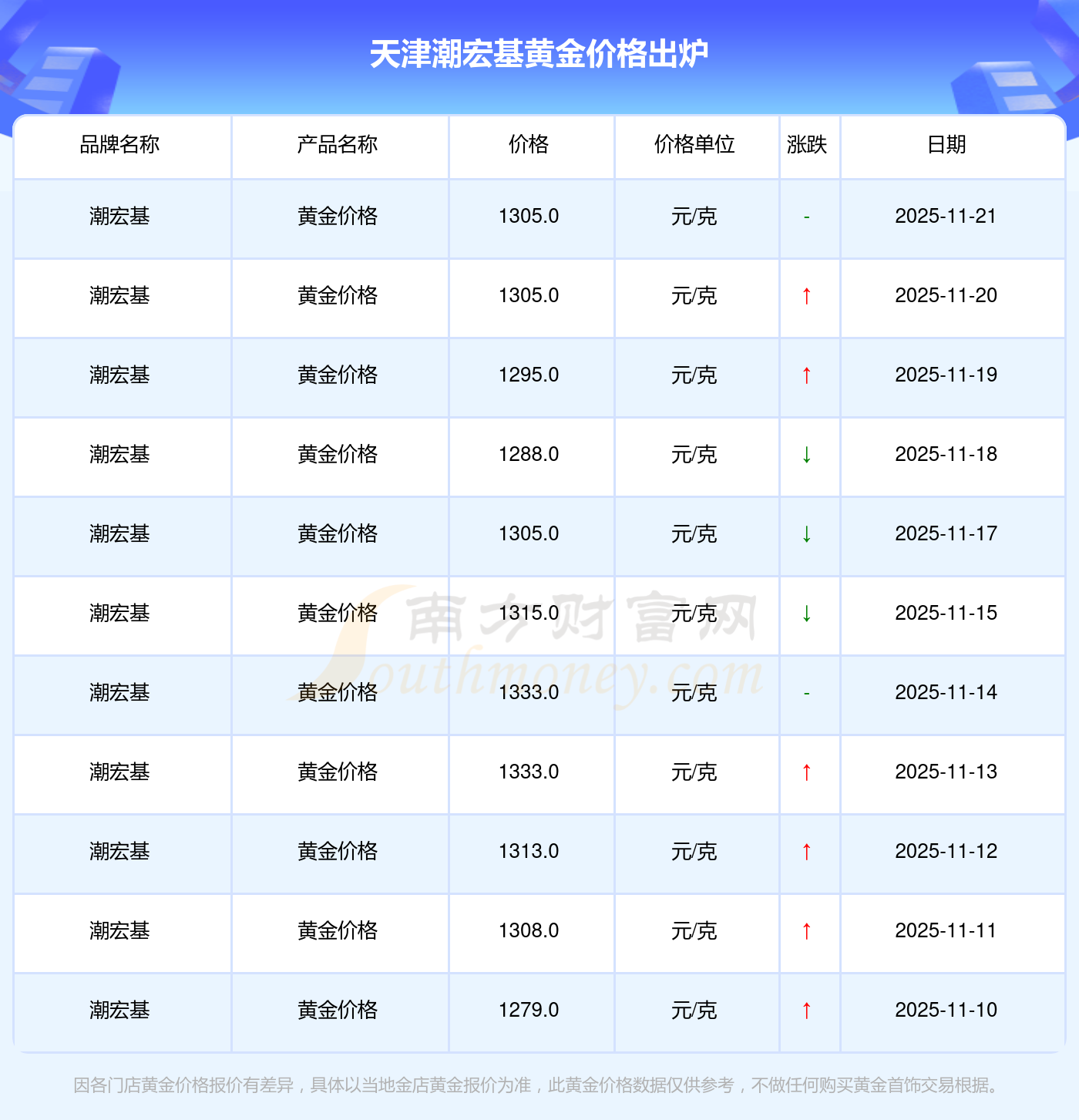 (2025年11月22日)今日天津潮宏基黄金价格是1305.0元/克。