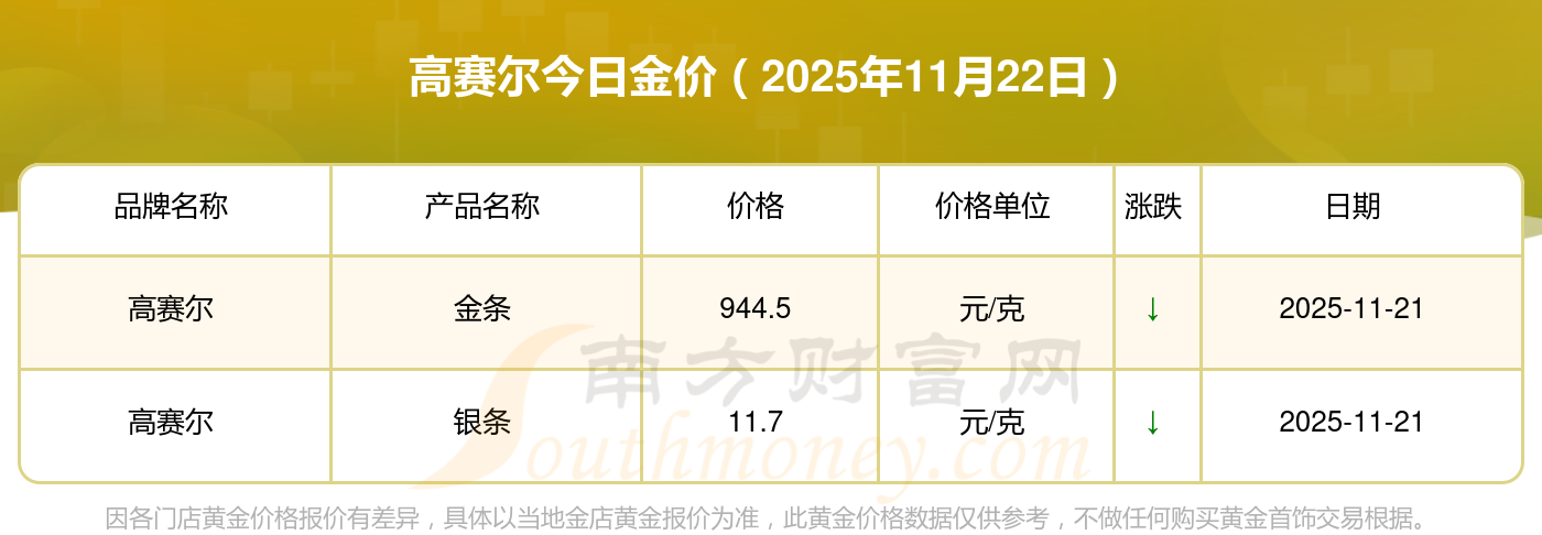 现在高赛尔黄金价格是多少钱1克_2025年高赛尔今日金价是多少钱一克,最新高赛尔查询,2025年11月22日高赛尔金条现在每克多少钱?最新高赛尔金条报价公布,一起来看看吧!
