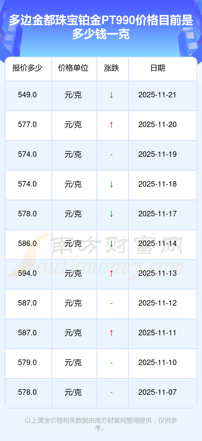 549.0元/克的价格,是多边金都珠宝今日 铂金PT990的最新行情。