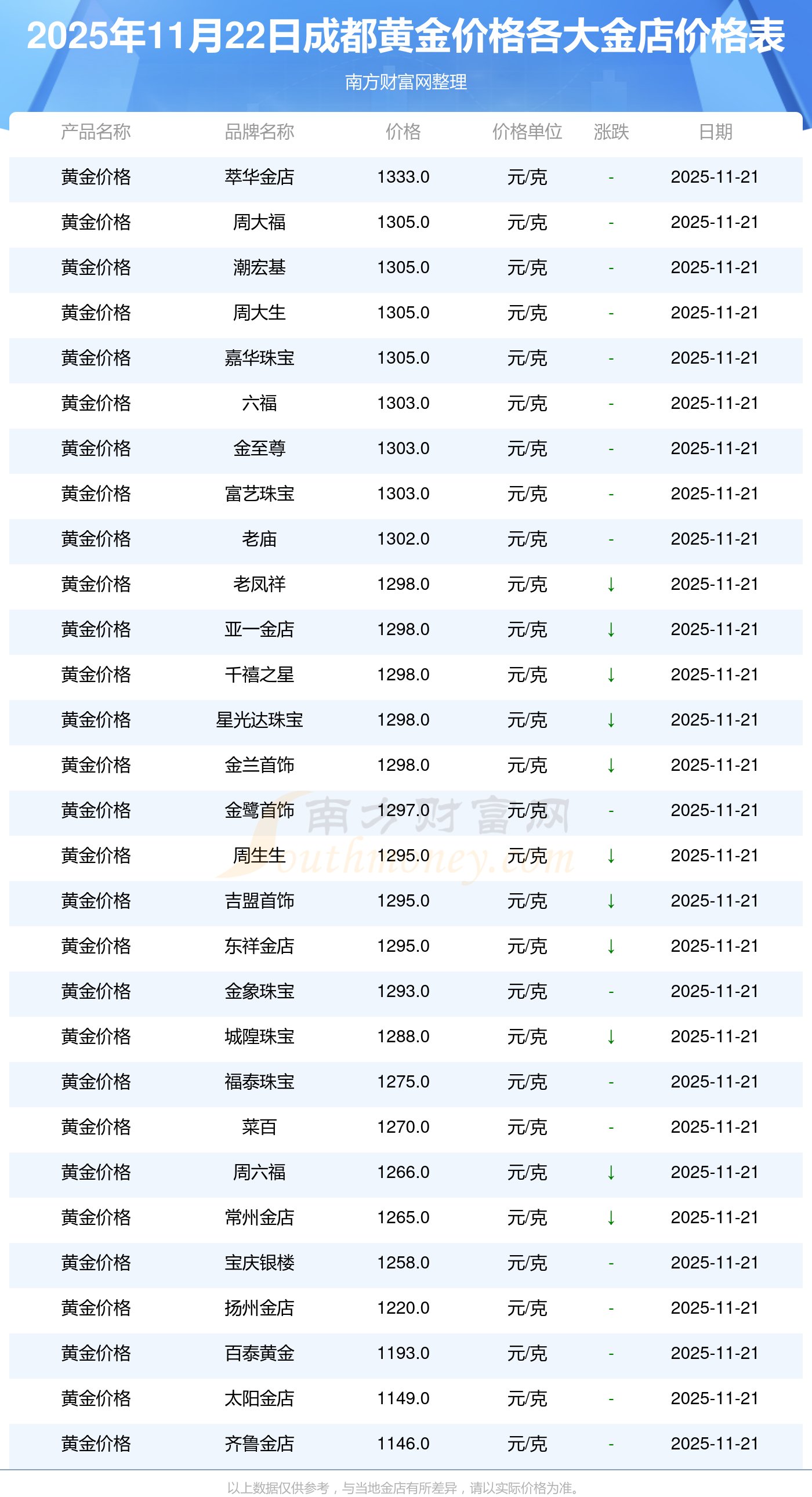 2025年11月22日,成都周大福、周大福、周大福、周大福、周大福、周大福、周大福、老凤祥、老凤祥、老凤祥、周六福等各大金店品牌黄金价格今日价格行情最新来了:周大福1305.0元/克、周大福616.0元/克、周大福1305.0元/克、周大福45110.0、周大福17570.0、周大福40690.0、周大福1143.0元/克、老凤祥1298.0元/克、老凤祥600.0元/克、老凤祥1298.0元/克、周六福1266.0元/克。