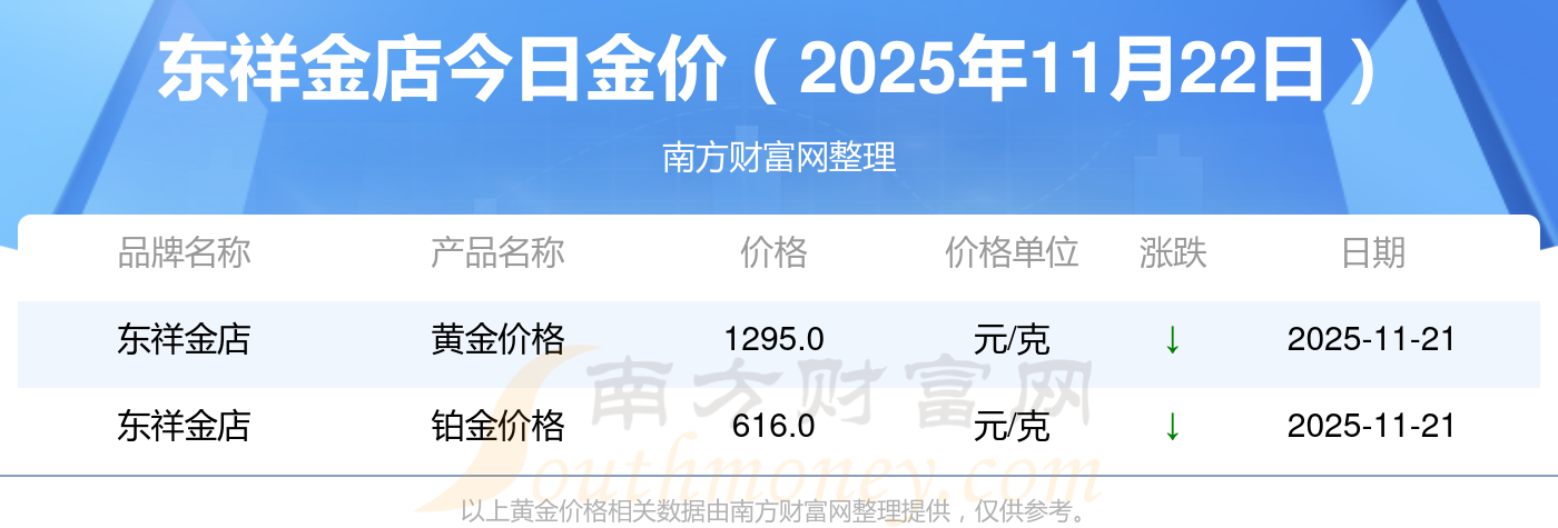 2025年11月22日东祥金店最新价格:黄金价格1305.0元/克,铂金价格616.0元/克,饰品金价(内地)1305.0元/克,黄金饰品(香港)45110.0,铂金价格(香港)17570.0,金条价格(香港)40690.0,金条金价(内地)1143.0元/克,黄金价格1298.0元/克,铂金价格600.0元/克,足金价格1298.0元/克,黄金价格1266.0元/克。