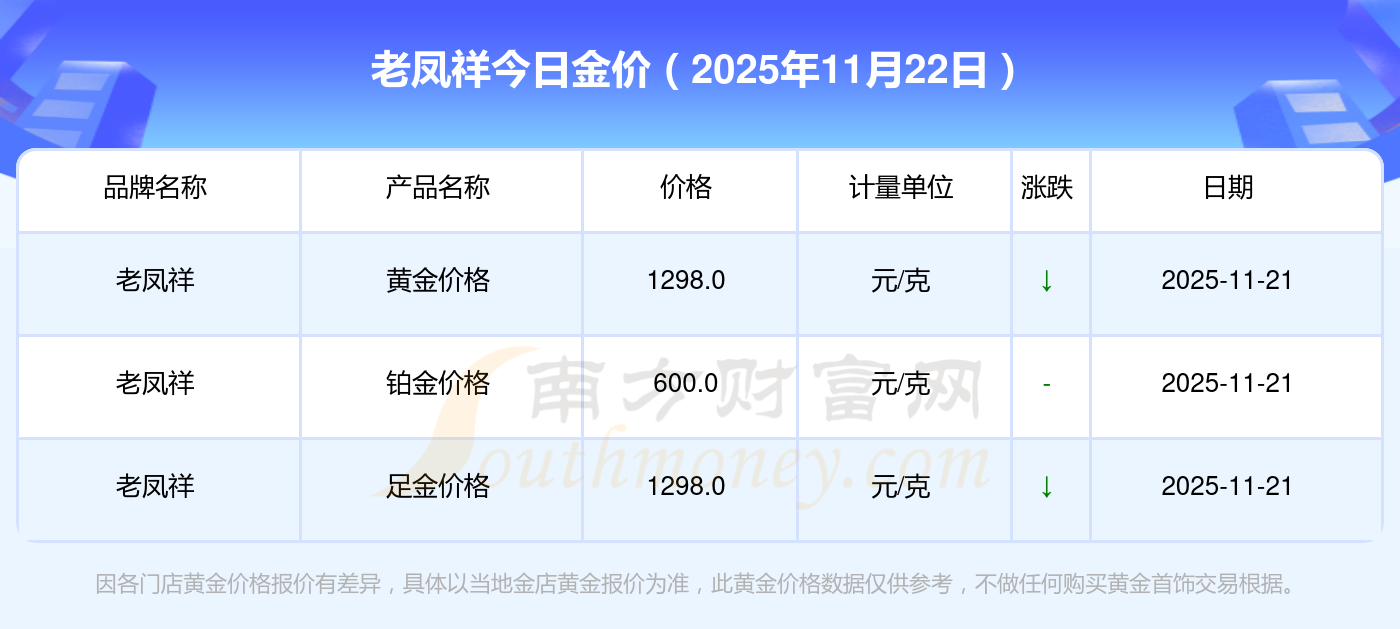 今天是2025年11月22日,周大福、周大福、周大福、周大福、周大福、周大福、周大福、老凤祥、老凤祥、老凤祥、周六福等各大金店品牌黄金价格最新价格如下:周大福1305.0元/克、周大福616.0元/克、周大福1305.0元/克、周大福45110.0、周大福17570.0、周大福40690.0、周大福1143.0元/克、老凤祥1298.0元/克、老凤祥600.0元/克、老凤祥1298.0元/克、周六福1266.0元/克。