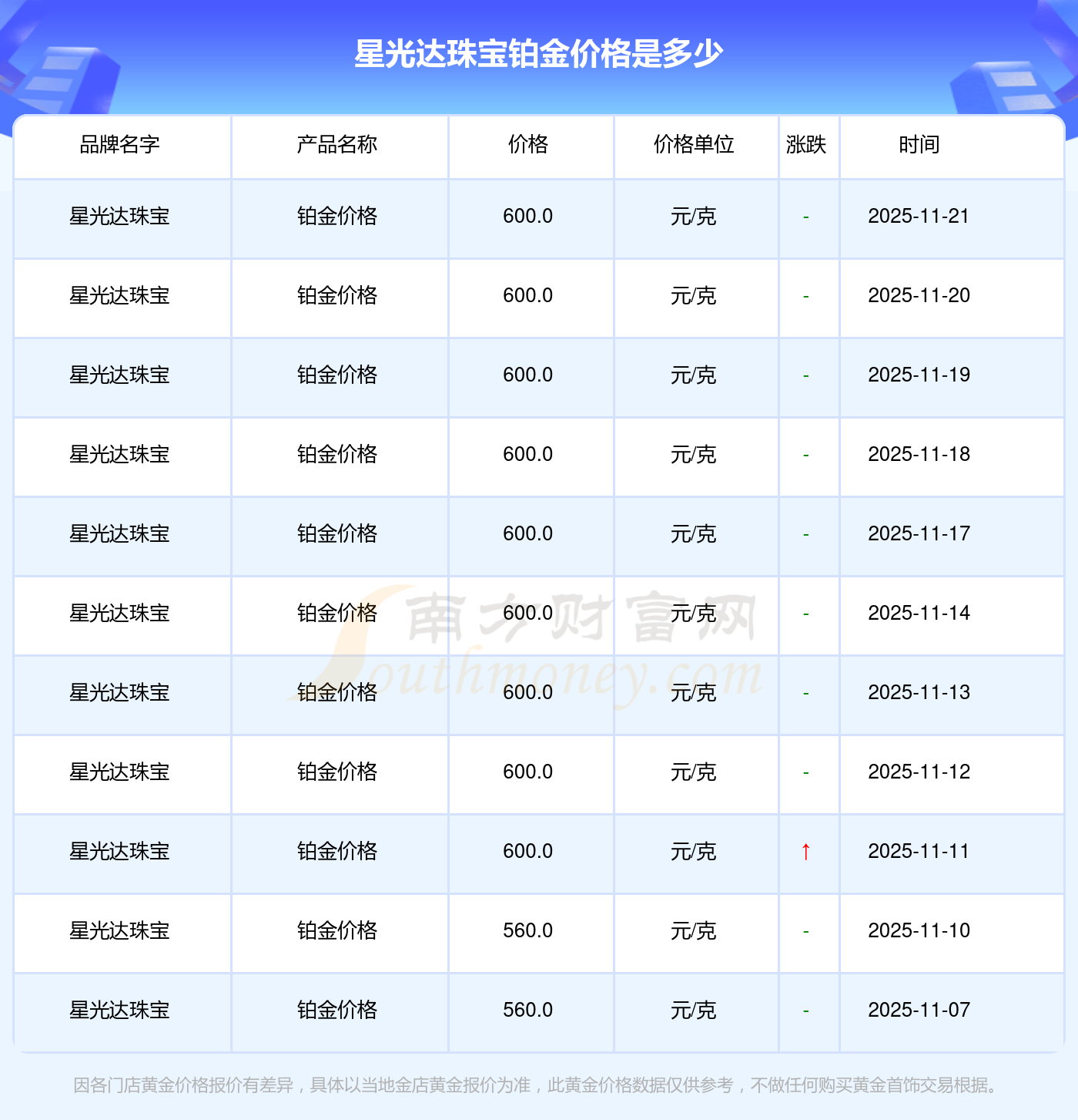 2025年11月22日星光达珠宝今日铂金价格来了(铂金价格今日多少一克),一起来看看吧!