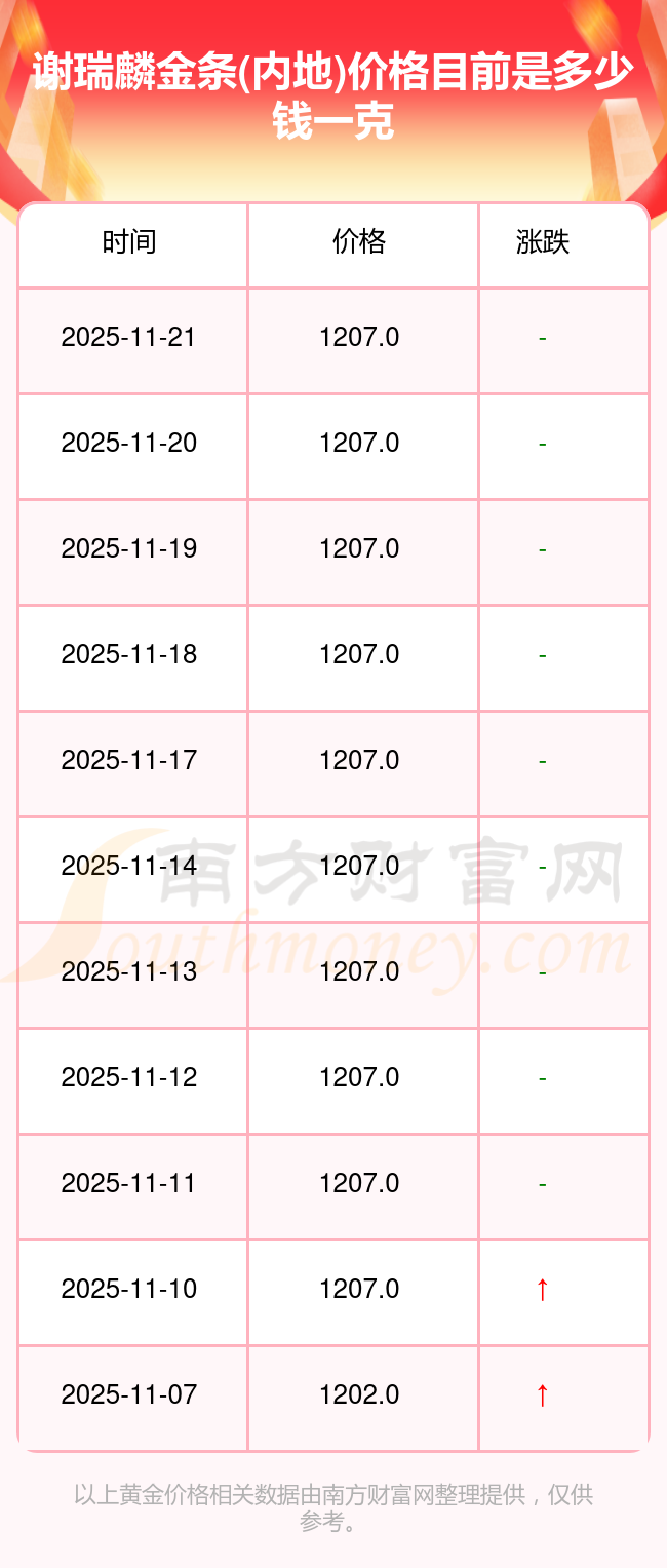 谢瑞麟今日 金条价格(内地)的最新市场行情价为1207.0元/克。
