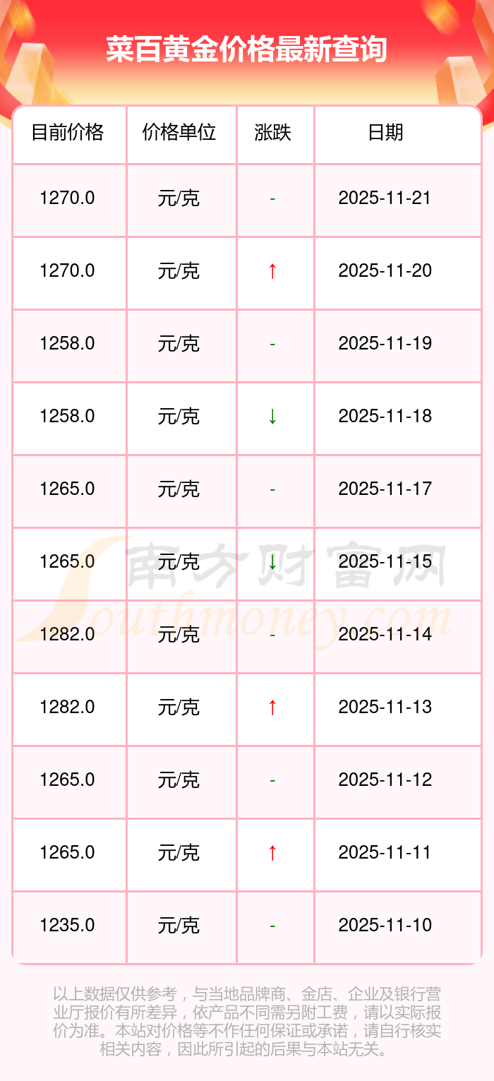 2025年11月22日菜百黄金价格查询:1270.0元/克。