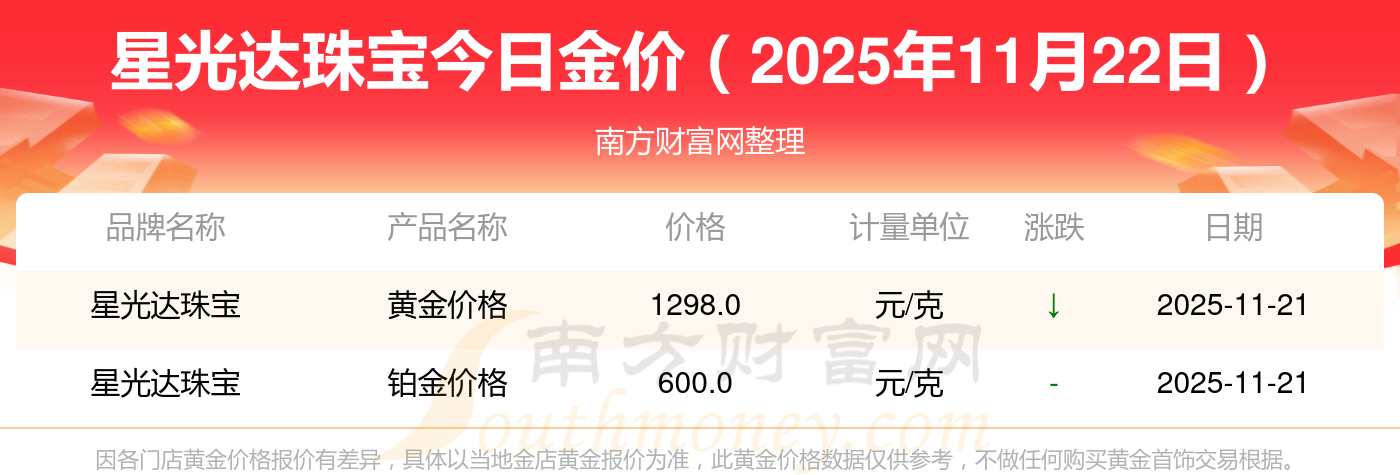 黄金价格1305.0元/克,铂金价格616.0元/克,饰品金价(内地)1305.0元/克,黄金饰品(香港)45110.0,铂金价格(香港)17570.0,金条价格(香港)40690.0,金条金价(内地)1143.0元/克,黄金价格1298.0元/克,铂金价格600.0元/克,足金价格1298.0元/克,黄金价格1266.0元/克。