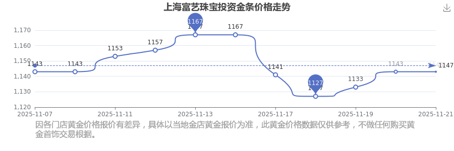 1143.0元/克,此乃上海富艺珠宝于 2025年11月22日投资金条的挂牌价格。