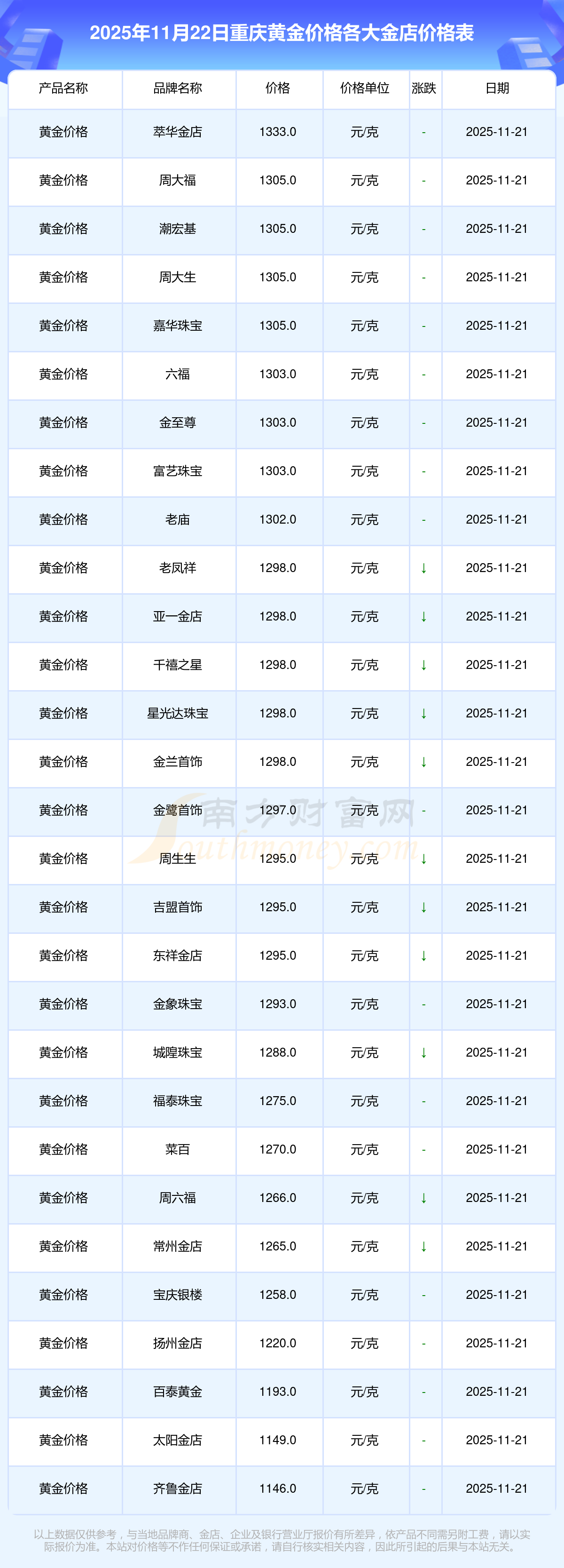 2025年11月22日重庆周大福、周大福、周大福、周大福、周大福、周大福、周大福、老凤祥、老凤祥、老凤祥、周六福等各大金店品牌黄金价格最新价格行情来了,如下:周大福黄金价格1305.0元/克,周大福铂金价格616.0元/克,周大福饰品金价(内地)1305.0元/克,周大福黄金饰品(香港)45110.0,周大福铂金价格(香港)17570.0,周大福金条价格(香港)40690.0,周大福金条金价(内地)1143.0元/克,老凤祥黄金价格1298.0元/克,老凤祥铂金价格600.0元/克,老凤祥足金价格1298.0元/克,周六福黄金价格1266.0元/克。