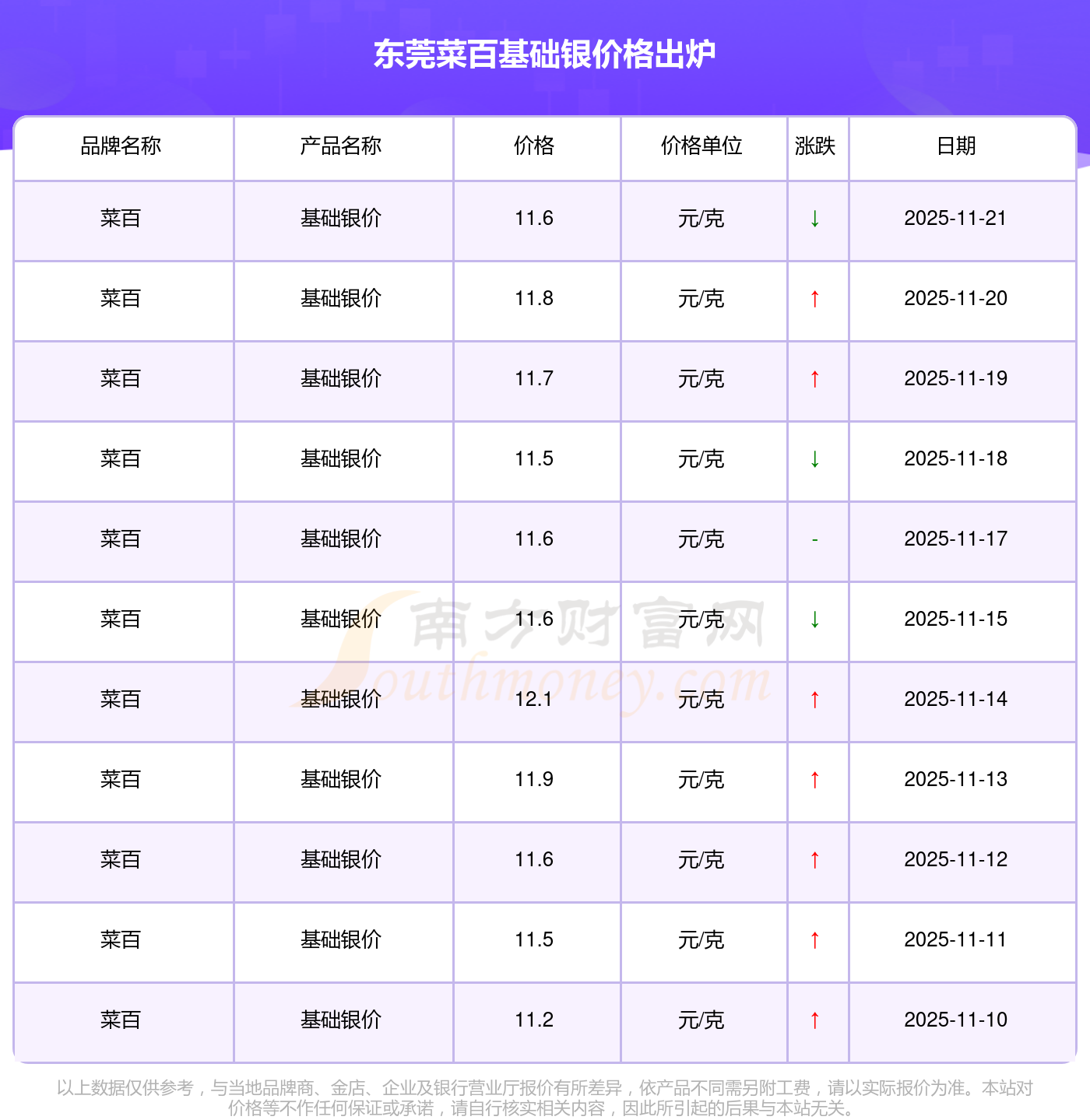 2025年11月22日,东莞菜百的基础银价标价达到 11.6元/克。