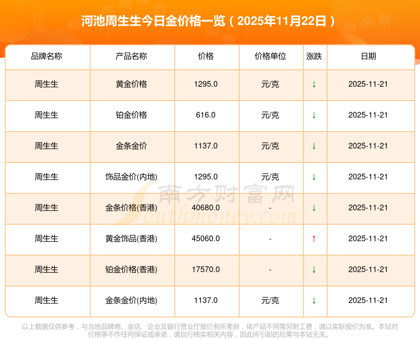 今日黄金价格查询_现在金价黄金一克多少钱,黄金价格是多少钱一克?2025年11月22日河池周生生现在黄金一克要多少钱:黄金价格1305.0元/克,铂金价格616.0元/克,饰品金价(内地)1305.0元/克,黄金饰品(香港)45110.0,铂金价格(香港)17570.0,金条价格(香港)40690.0,金条金价(内地)1143.0元/克,黄金价格1298.0元/克,铂金价格600.0元/克,足金价格1298.0元/克,黄金价格1266.0元/克。