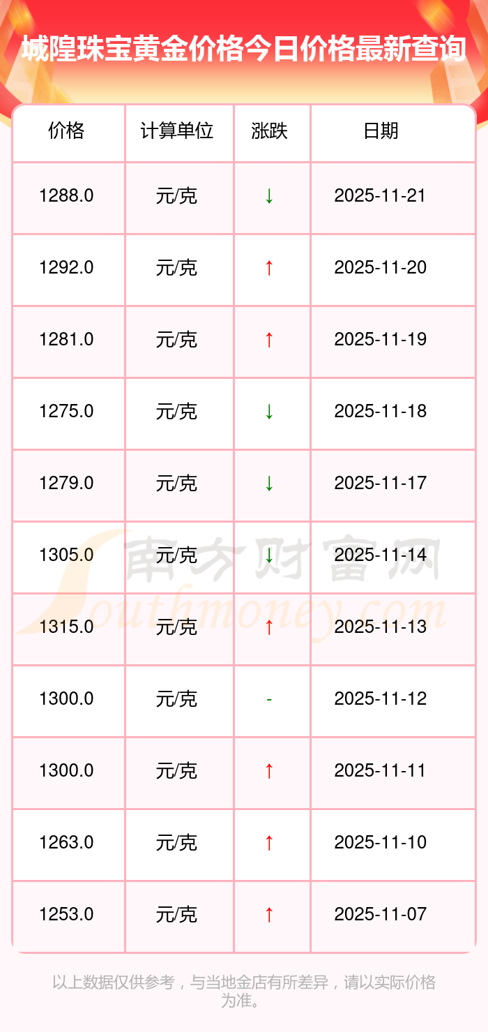 据了解,今日城隍珠宝 黄金价格的最新价格为1288.0元/克。