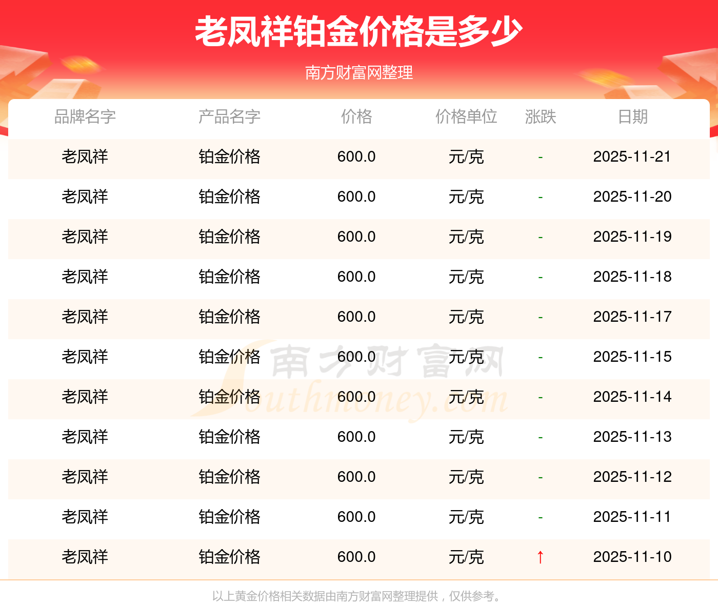 今日老凤祥 铂金价格最新的克重售价为600.0元/克。