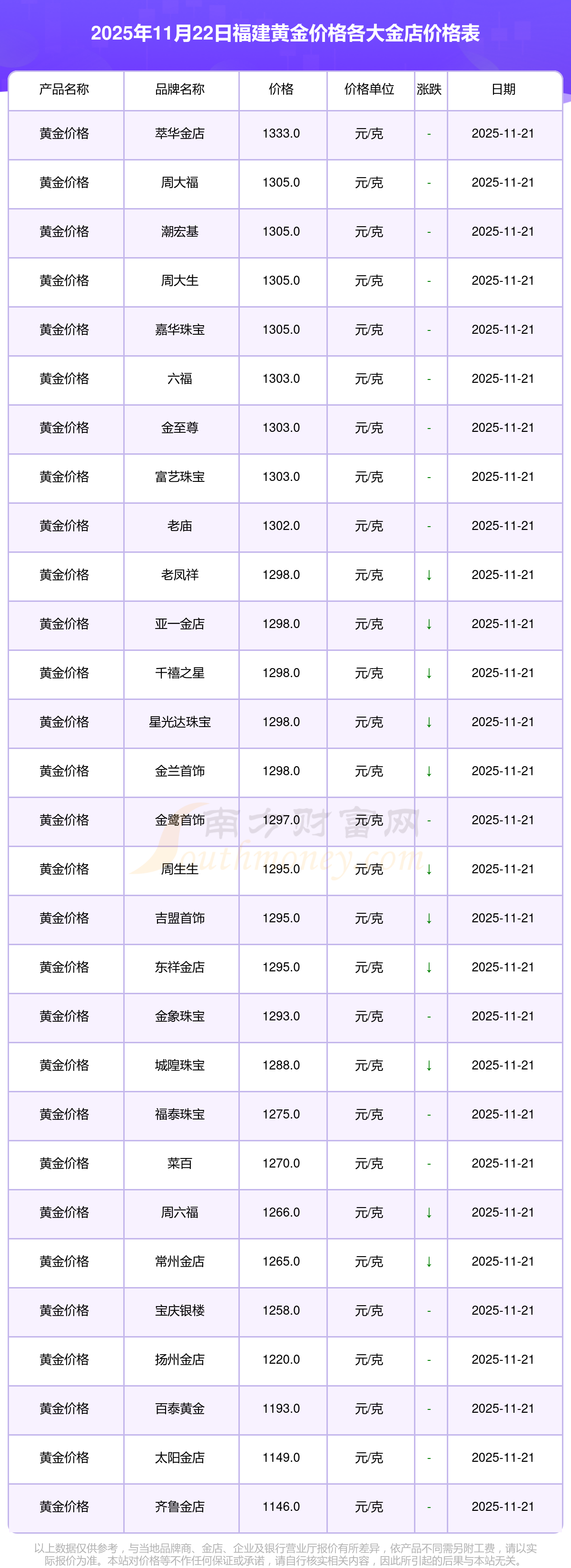 今天是2025年11月22日,福建周大福、周大福、周大福、周大福、周大福、周大福、周大福、老凤祥、老凤祥、老凤祥、周六福等各大金店品牌黄金价格最新价格如下:周大福1305.0元/克、周大福616.0元/克、周大福1305.0元/克、周大福45110.0、周大福17570.0、周大福40690.0、周大福1143.0元/克、老凤祥1298.0元/克、老凤祥600.0元/克、老凤祥1298.0元/克、周六福1266.0元/克。