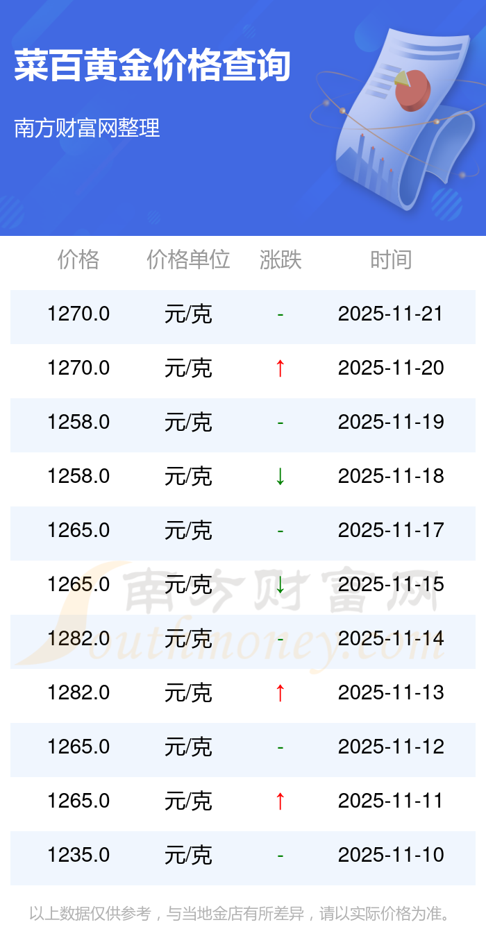 想了解今日黄金价格,现在每克黄金的价格是多少呢?平常来说一克黄金的价格大概是多少?菜百 黄金价格今日最新的价位是1270.0元/克。