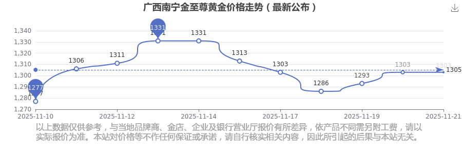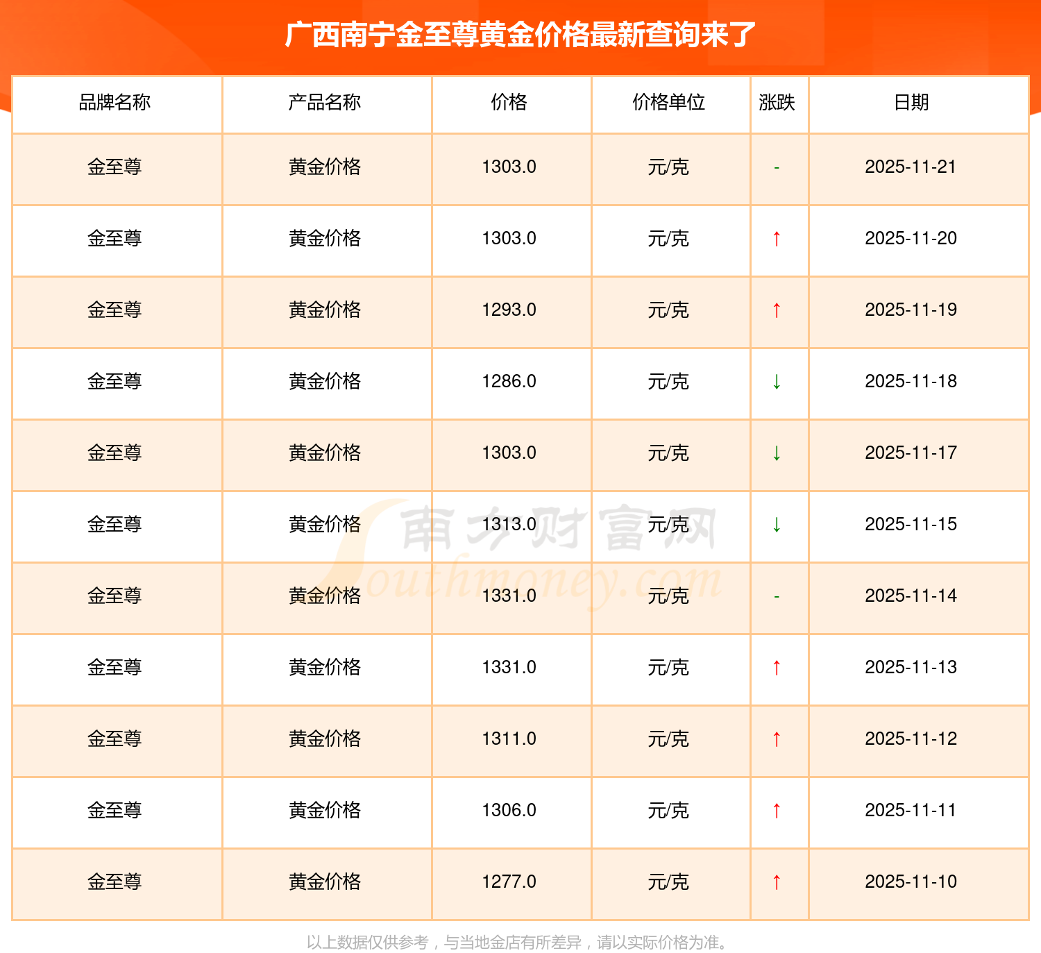 2025年11月23日当天,广西南宁金至尊黄金价格的单价是 1303.0元/克。