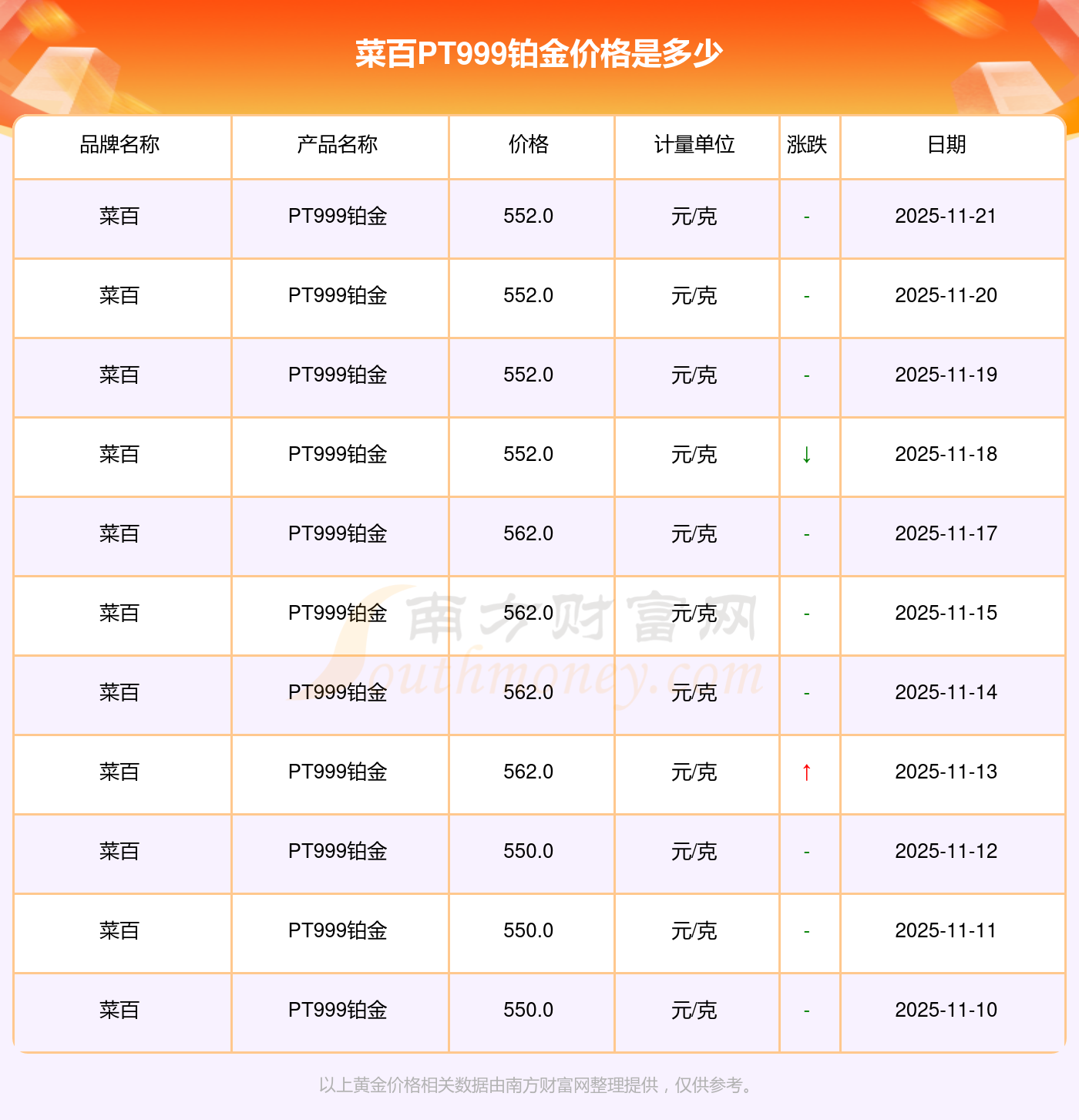 2025年11月23日菜百PT999铂金价格查询:552.0元/克。