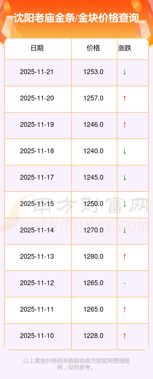 今日沈阳老庙金条/金块价格为1253.0元/克。