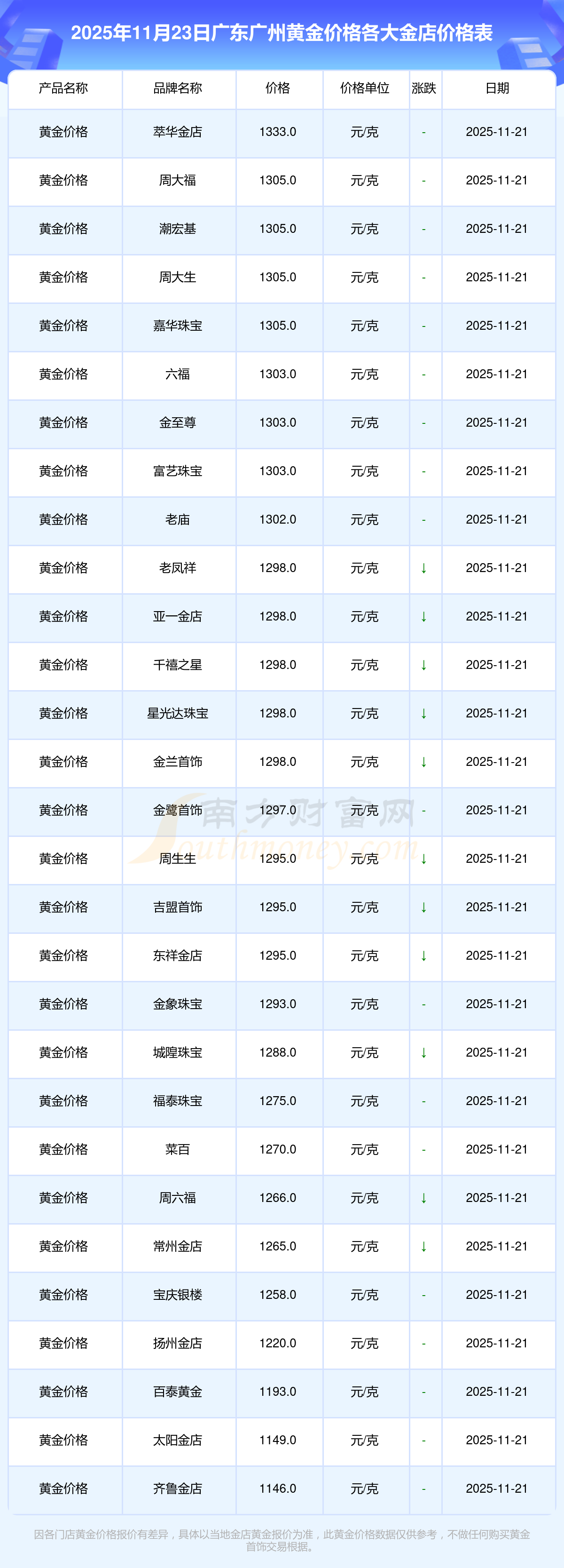 2025年11月23日广东广州各大金店黄金价格最新价格:周大福1305.0元/克,周大福616.0元/克,周大福1305.0元/克,周大福45110.0,周大福17570.0,周大福40690.0,周大福1143.0元/克,老凤祥1298.0元/克,老凤祥600.0元/克,老凤祥1298.0元/克,周六福1266.0元/克。