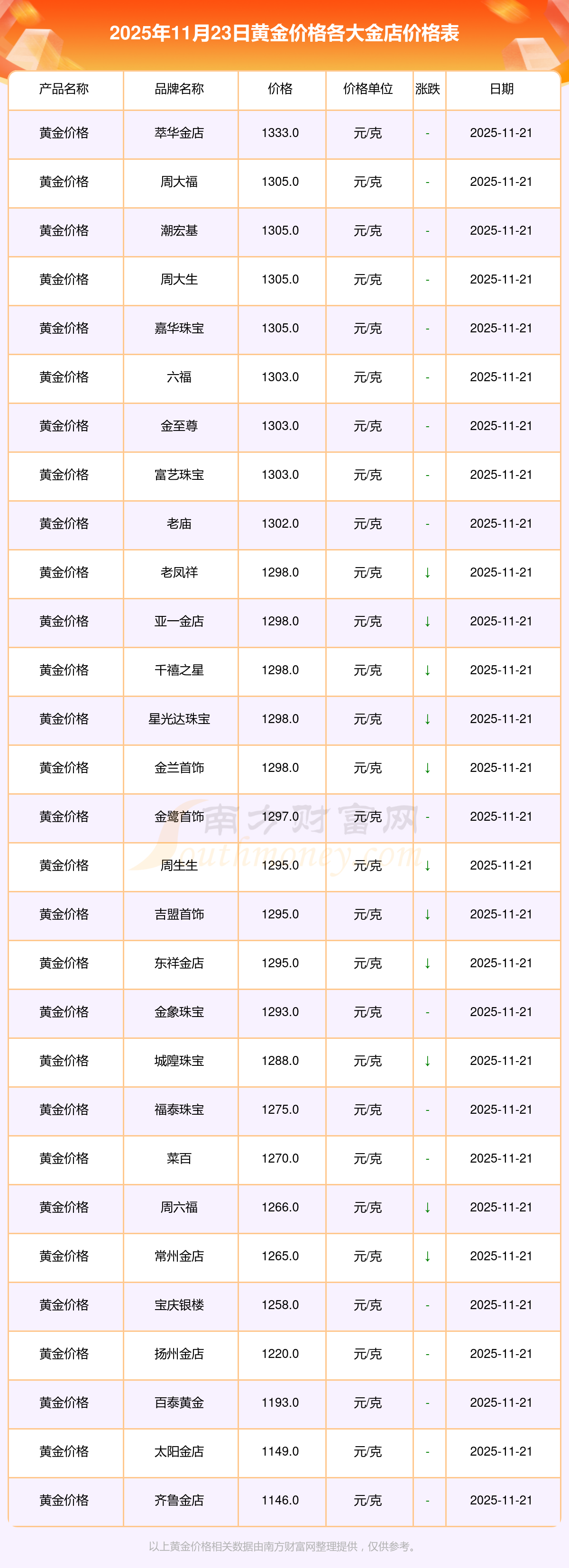 2025年11月23日,周大福、周大福、周大福、周大福、周大福、周大福、周大福、老凤祥、老凤祥、老凤祥、周六福等各大金店品牌黄金价格今日价格如下:周大福1305.0元/克、周大福616.0元/克、周大福1305.0元/克、周大福45110.0、周大福17570.0、周大福40690.0、周大福1143.0元/克、老凤祥1298.0元/克、老凤祥600.0元/克、老凤祥1298.0元/克、周六福1266.0元/克。