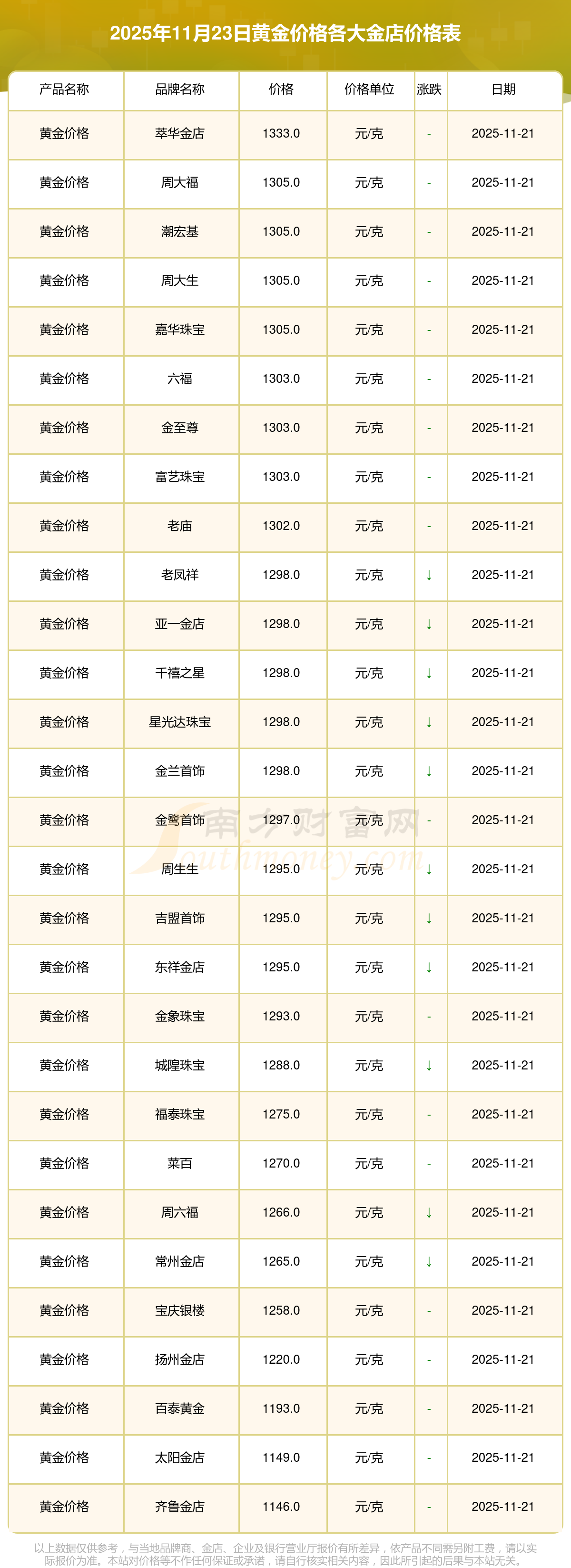 今天是2025年11月23日,周大福、周大福、周大福、周大福、周大福、周大福、周大福、老凤祥、老凤祥、老凤祥、周六福等各大金店品牌黄金价格最新价格如下:周大福1305.0元/克、周大福616.0元/克、周大福1305.0元/克、周大福45110.0、周大福17570.0、周大福40690.0、周大福1143.0元/克、老凤祥1298.0元/克、老凤祥600.0元/克、老凤祥1298.0元/克、周六福1266.0元/克。