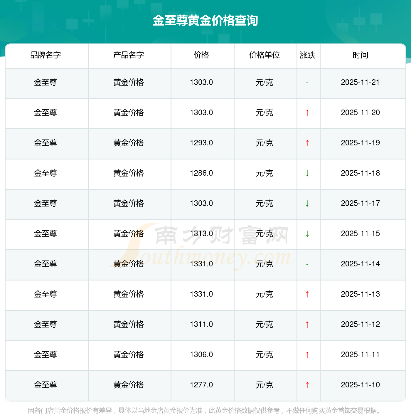 今天黄金价位怎样呢?现在每克黄金卖多少钱?黄金价格一般是多少钱一克?2025年11月23日金至尊黄金价格是1303.0元/克。