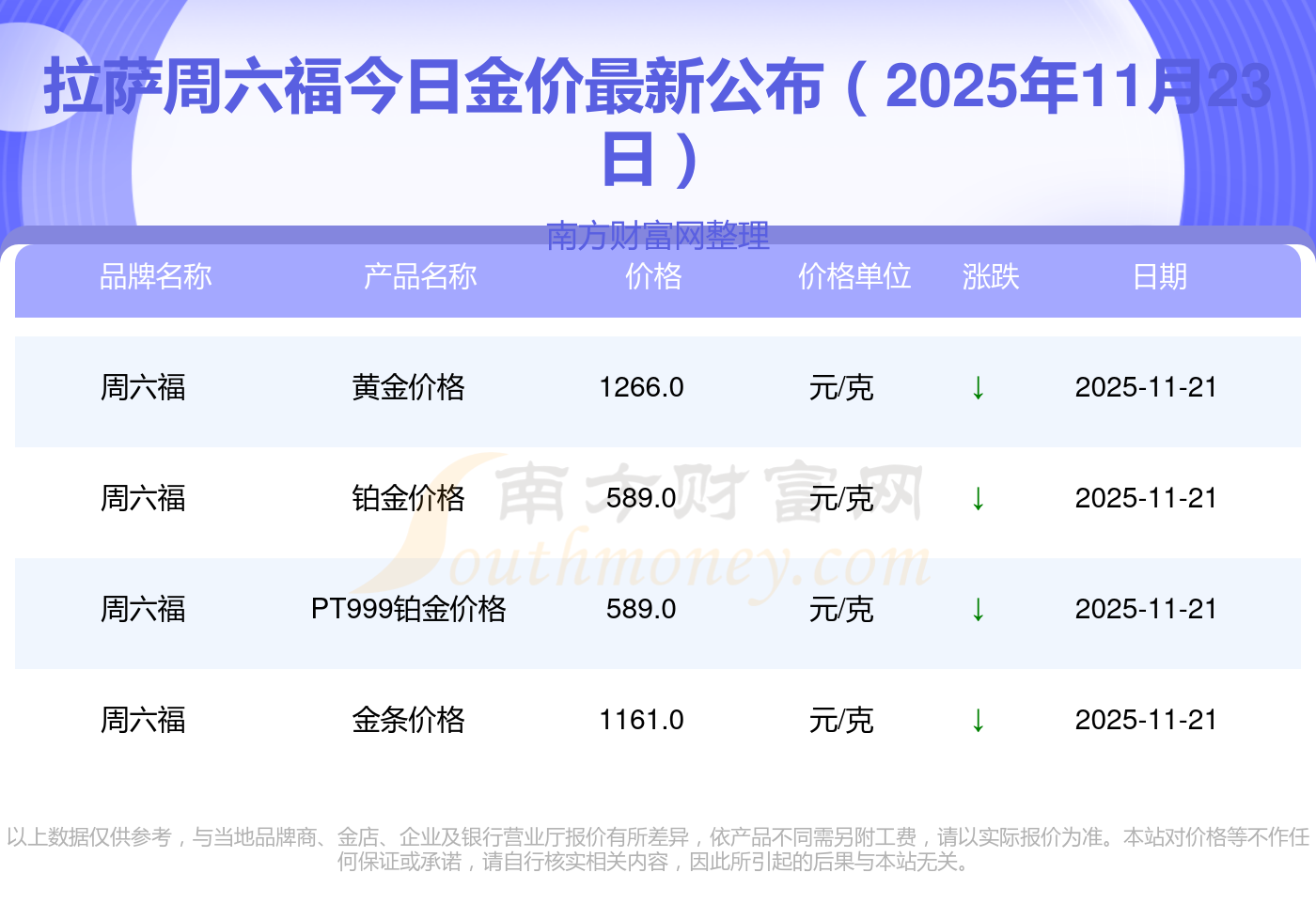 以上数据仅供参考,与当地品牌商、金店、企业及银行营业厅报价有所差异,依产品不同需另附工费,请以实际报价为准。本站对价格等不作任何保证或承诺,请自行核实相关内容,因此所引起的后果与本站无关。