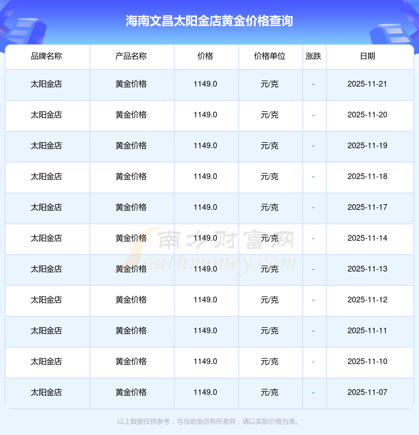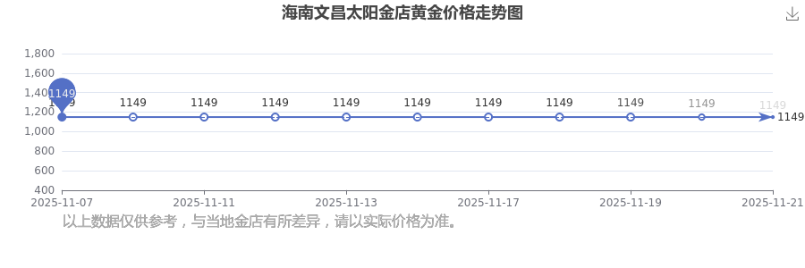今日(2025年11月23日)海南文昌太阳金店黄金价格为1149.0元/克。