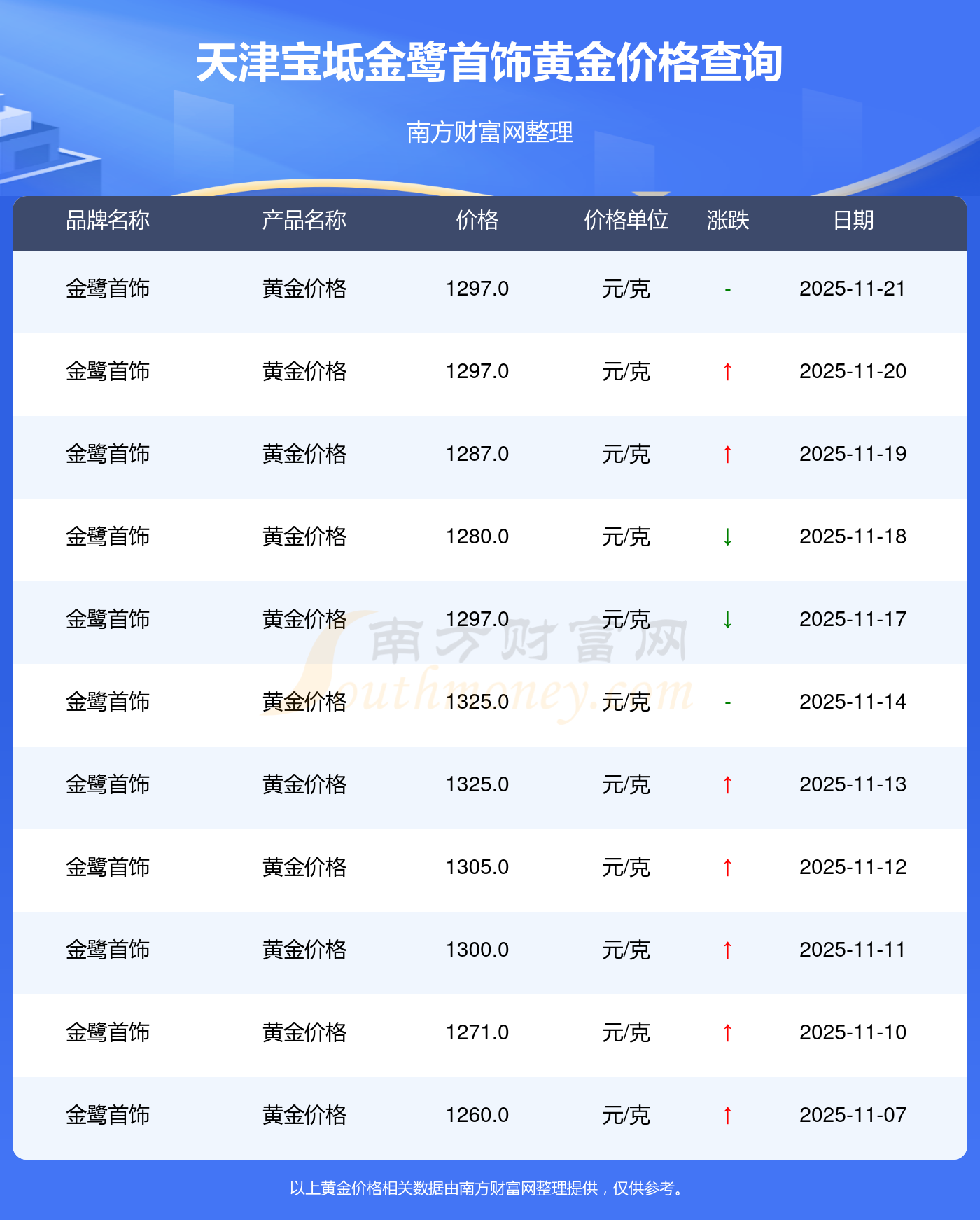 今日(2025年11月23日),天津宝坻金鹭首饰黄金价格的定价为 1297.0元/克。